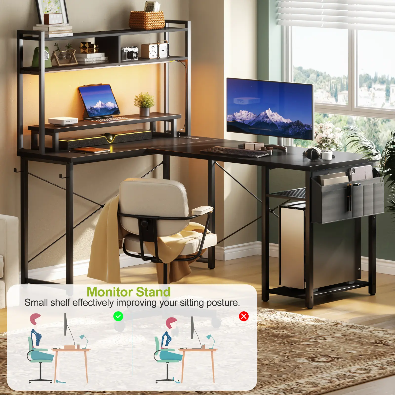 3. With Monitor Stand Shelf. moveable monitor stand elevates your line of sight and keeps you maintaining proper sitting posture.