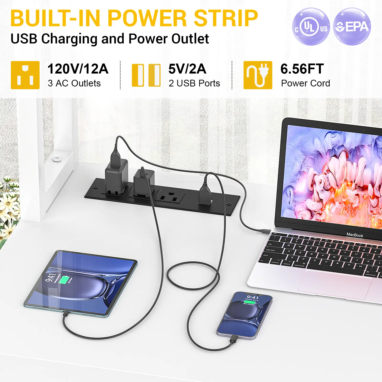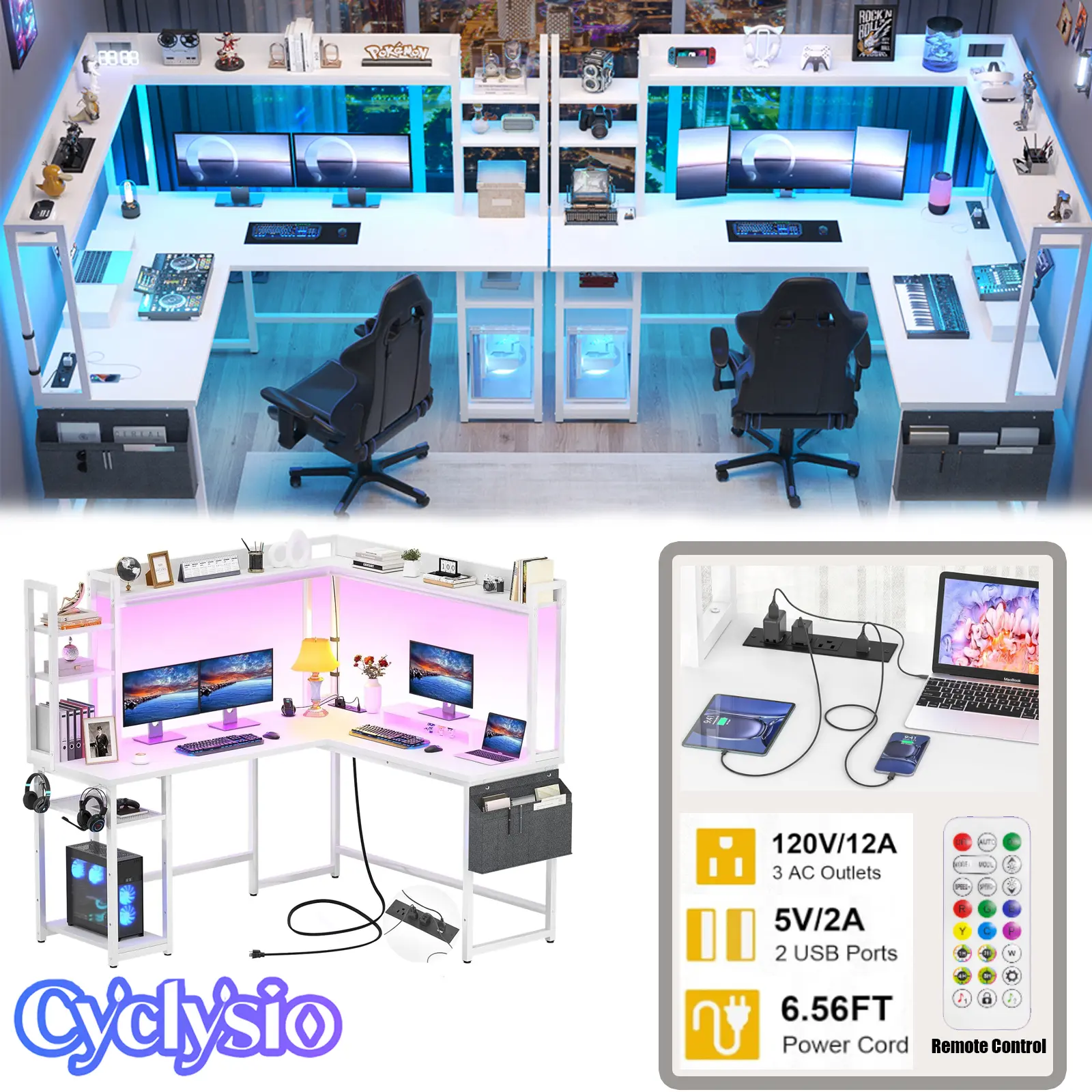 Our L-shaped desk comes with a built-in power center featuring 3 outlets and 2 USB ports, allowing you to power up to 5 devices at once. Charge your phone, computer, headset, and gaming gear with ease, without the need for additional power strips cluttering your workspace. This convenient design keeps your desk tidy and your devices ready to go.