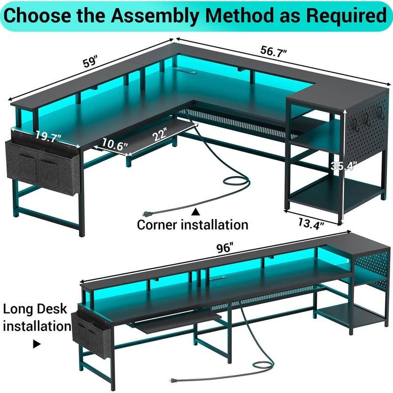Sikaic L Shaped Reversible LED Gaming Desk with Power Outlets Strip Monitor Shelf Keyboard Tray Pegboard and Storage Shelves