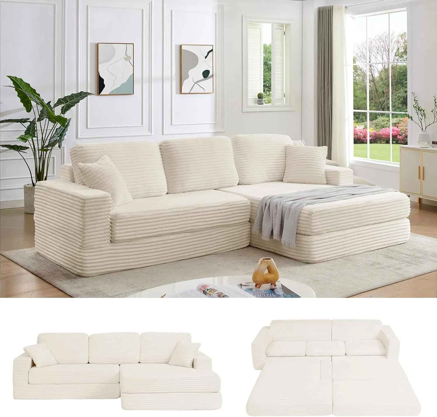 3.Modern Design: More than just an cloud couch sectional, you can combine it with other sections or use it alone to suit your needs. The straight-cut edges and elegant and warm appearance not only look beautiful but are also soft and durable. Coupled with the extra-wide seat, the corduroy sectional provides a place to enjoy watching movies or relaxing with family or friends.
