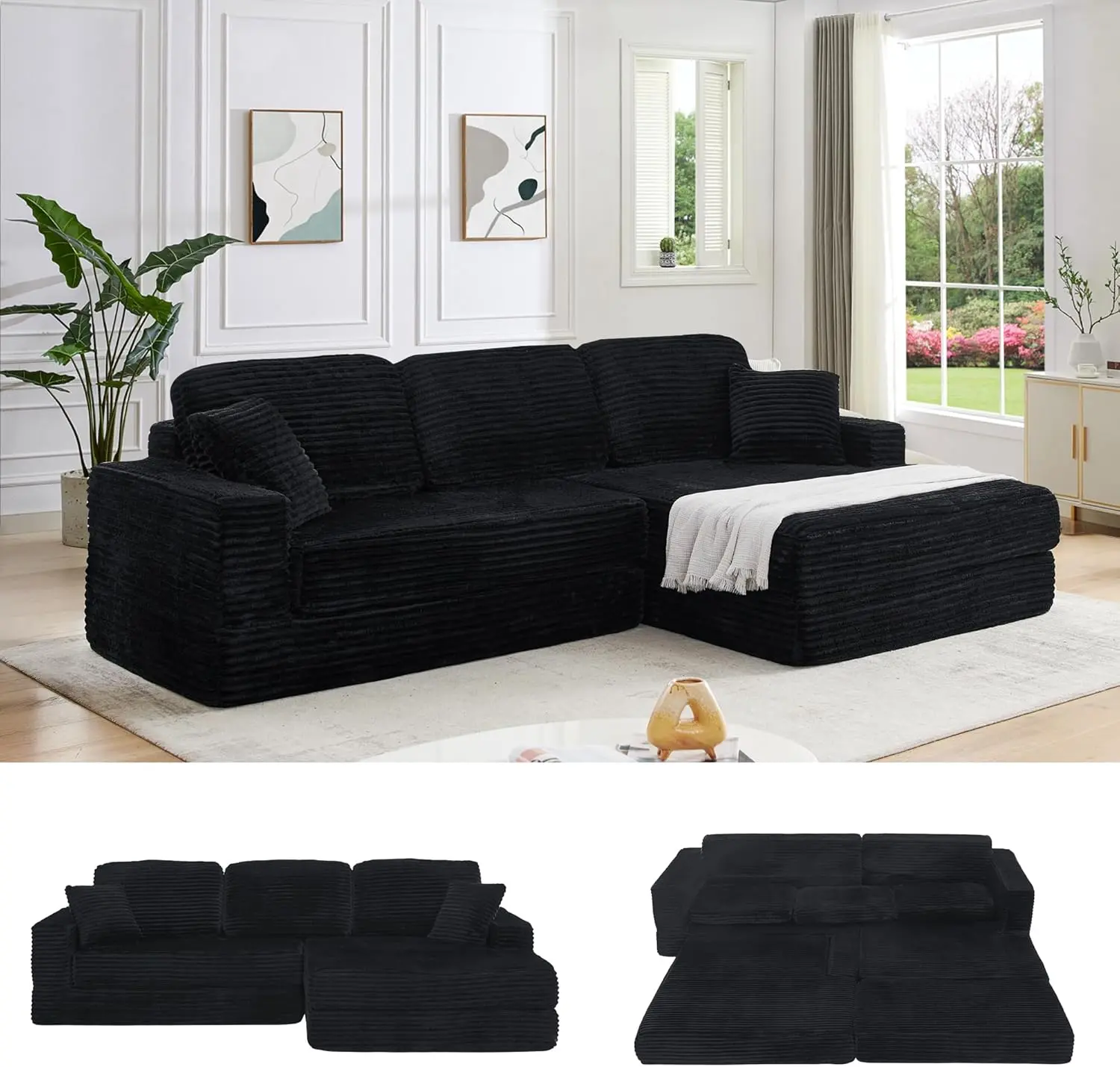 2.Comfortable Sitting Area: This l sectional couch set features comfortable, spacious seating. The modular sofa is made of soft, breathable corduroy fabric, and the sponge structure is comfortable and durable.