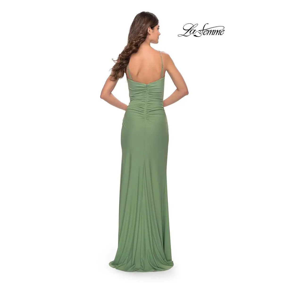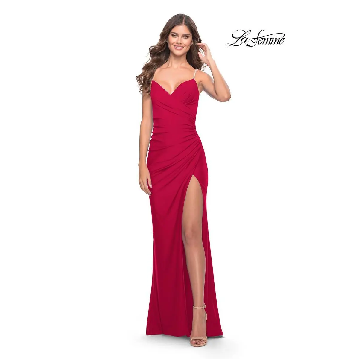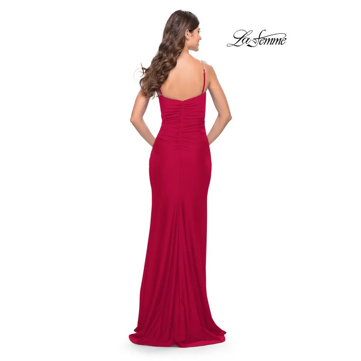 We are loving the vibrant tones on this figure flattering gown designed by La Femme from Spring 2023 Collection. 31107, showcases a sweetheart v neckline with thin spaghetti straps that are dazzled up! The jersey gown has soft ruching to give you the hourglass effect. A sexy leg slit completes this stunning look. Perfect for Senior Prom, College formal and much more.