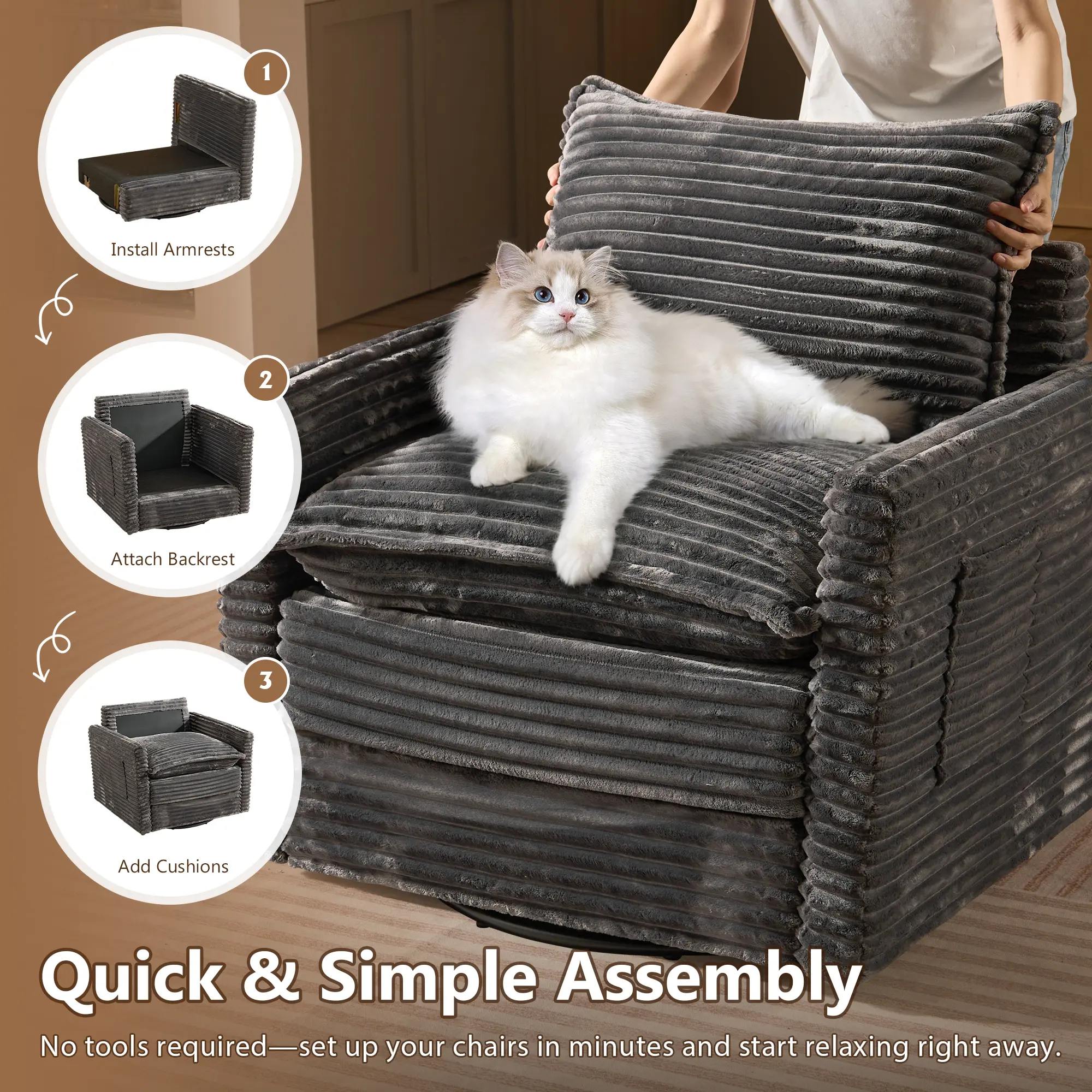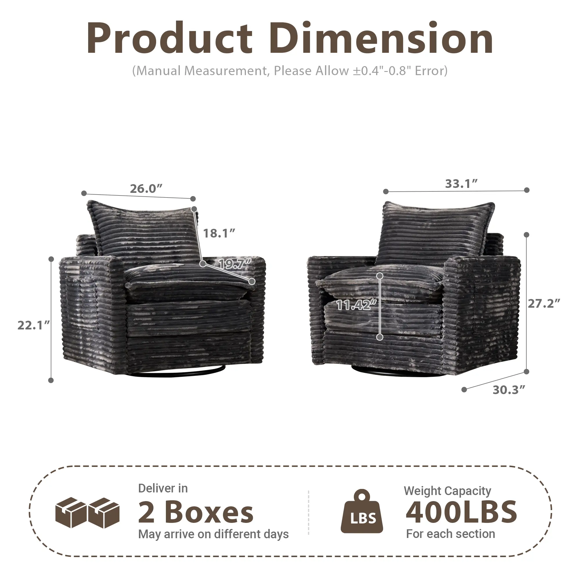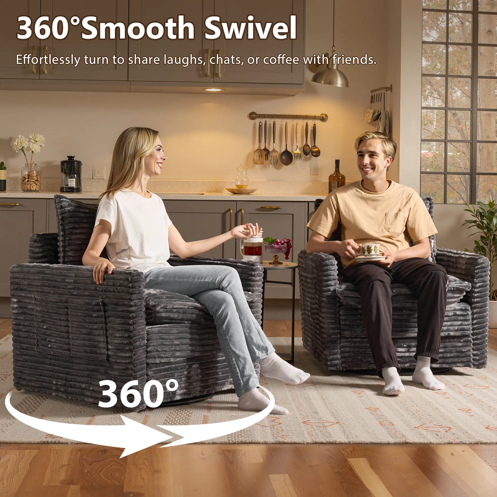 🌟 Key Features 🌟 • Oversized Design: 33 inches wide, perfect for large spaces. • Smooth Swivel: 360° rotation for easy access. • Armrests Included: Enhance comfort during use. • Plush Fabric: Soft and inviting, suitable for living areas.