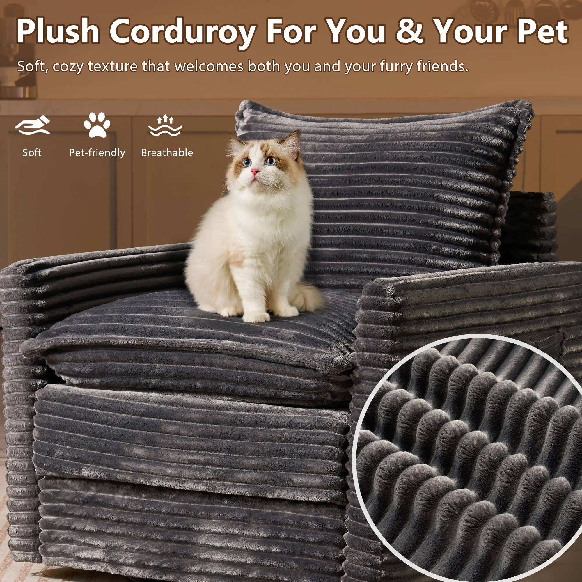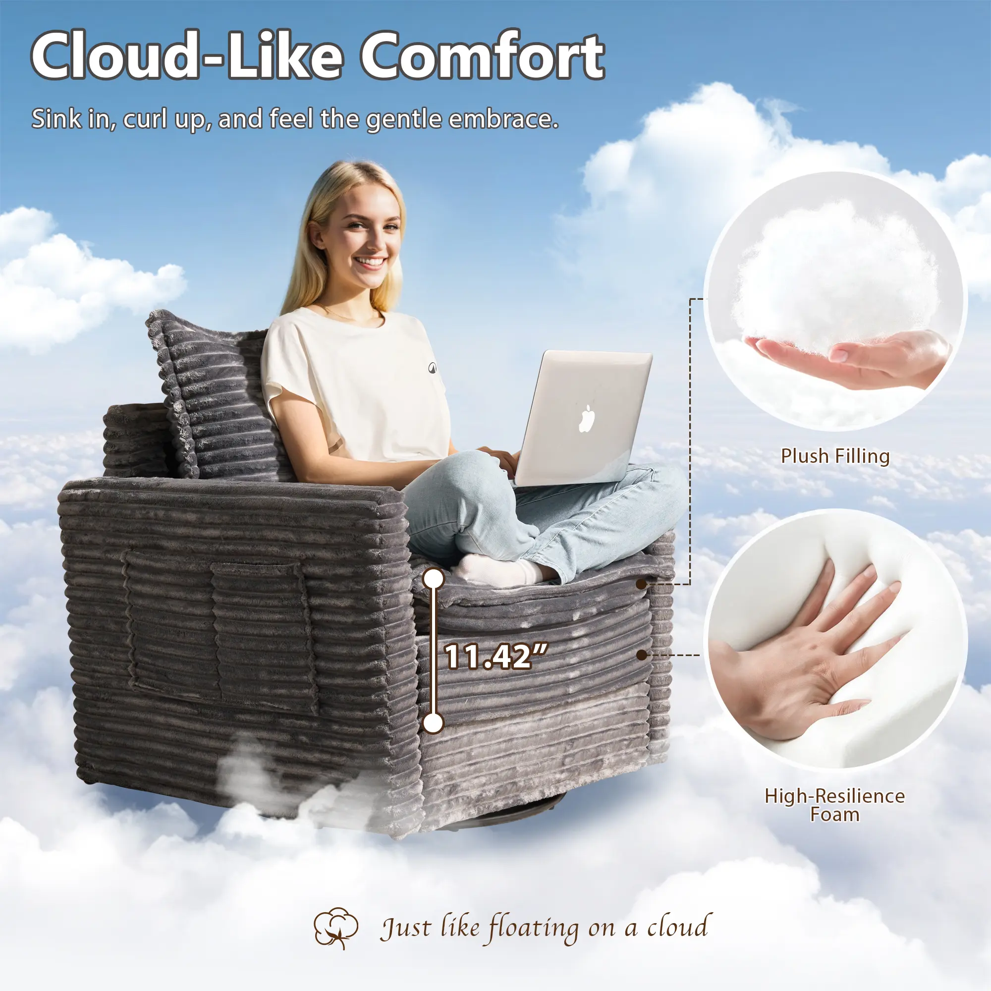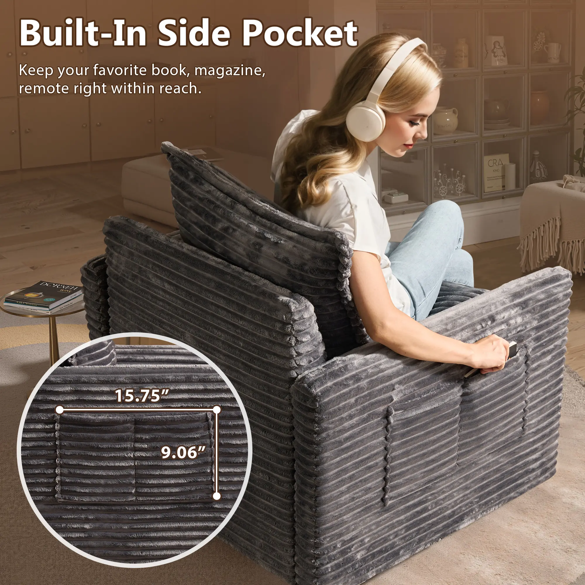 5. XIZZI 33" Rotating Chair with Thickened Cushions, Side Pockets Included, 360° Smooth Swivel and Rocking, Lovesac Deep Seat, Comfortable Plush Corduroy Suitable for Living Room