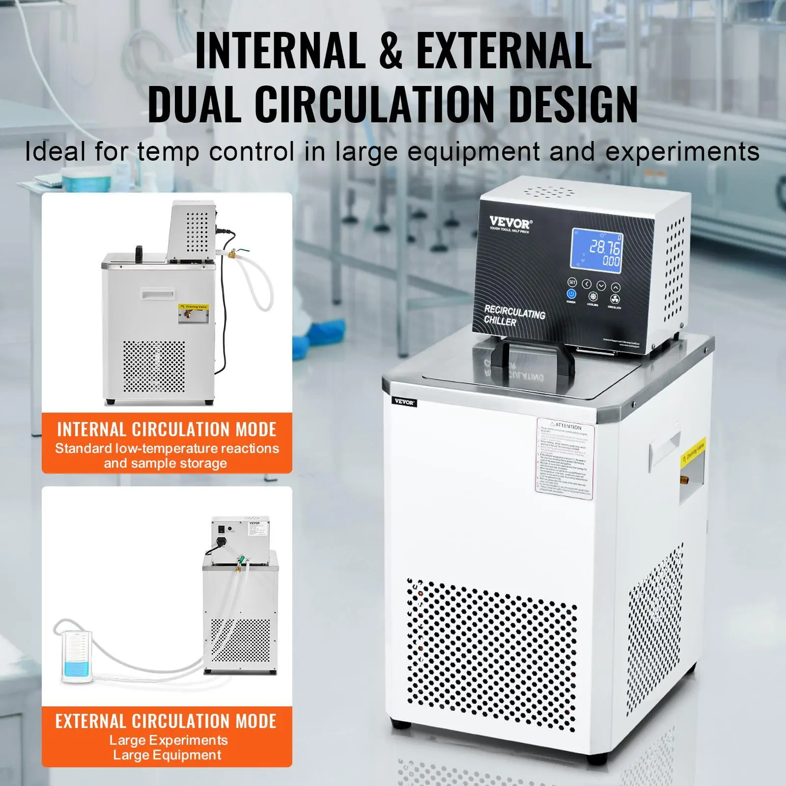 • Internal and External Dual Circulation System: The lab recirculating chiller features internal mode for stable, precise temperatures in small-scale experiments and storage, and external mode for seamless integration with equipment, supporting large-scale experiments and industrial applications. .The dual circulation design enhances equipment versatility and flexibility.
