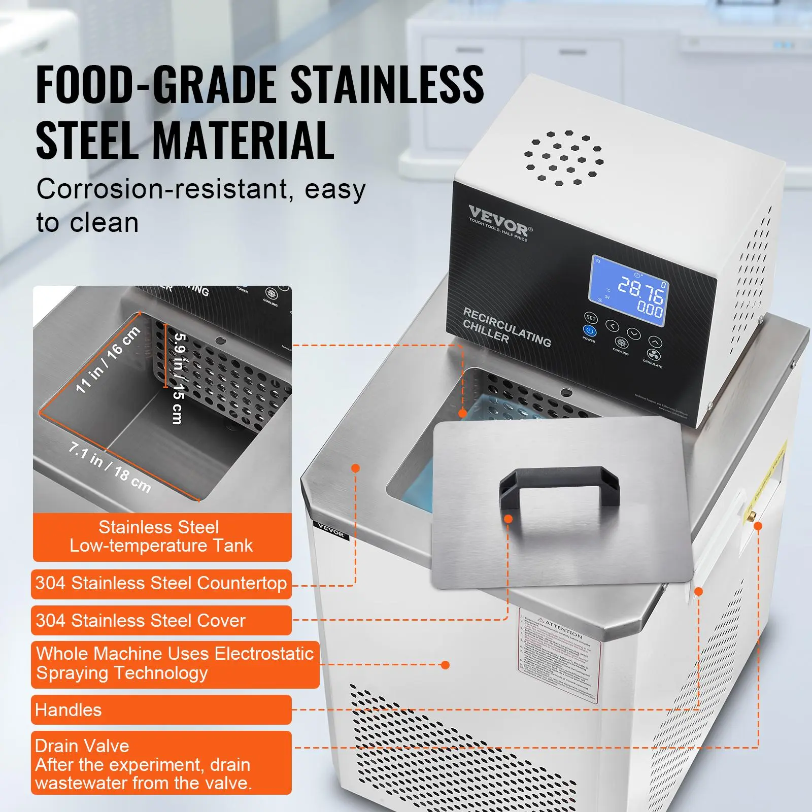• High-Quality Compressor and Circulation Pump: VEVOR laboratory chiller circulator features an efficient fully enclosed compressor, compact structure, fast cooling speed, and strong temperature stability for long-term constant temperature operation. The quiet circulation water pump ensures low noise and smooth operation, maintaining stable water flow over extended periods.