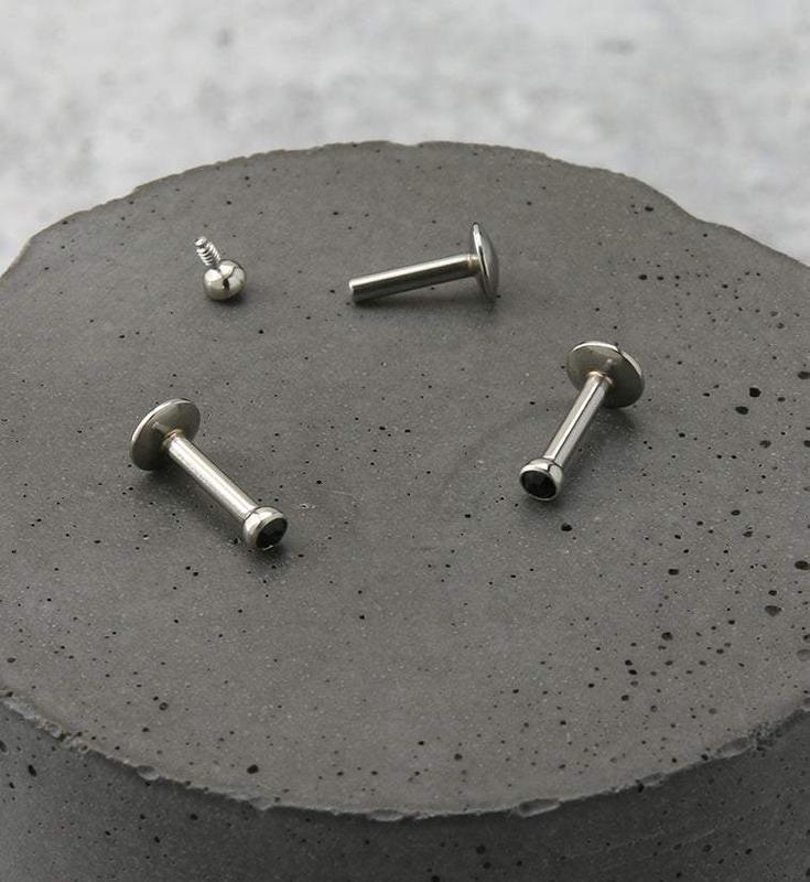 Sparkling labret studs to add to your jewelry collection! These internally threaded labret studs are made with 316L stainless steel, completed with 2mm black cubic zirconia gems on top. Choose your length: 1/4" (6mm), 5/16" (8mm), 3/8" (10mm). Gauge size is 16G. 4mm rounded convex disk. Internally threaded. Sold individually (1pc).