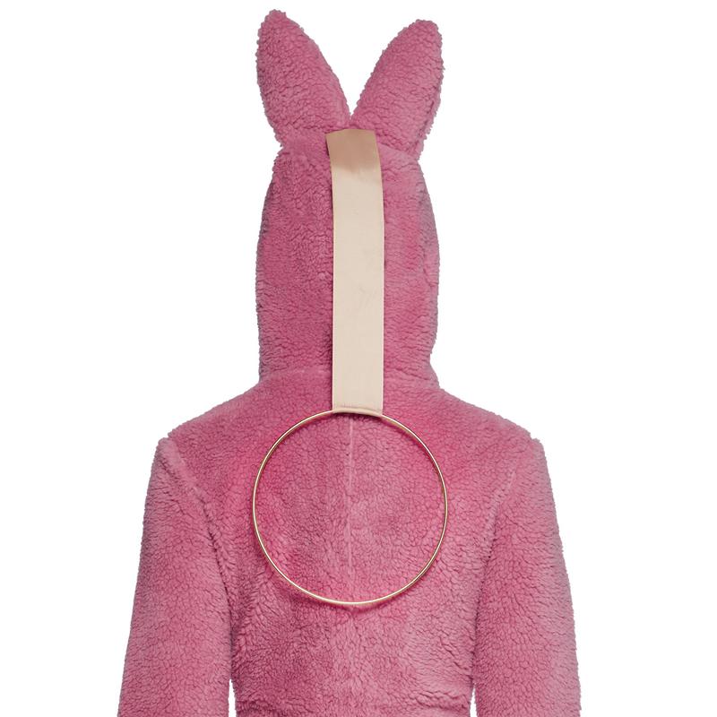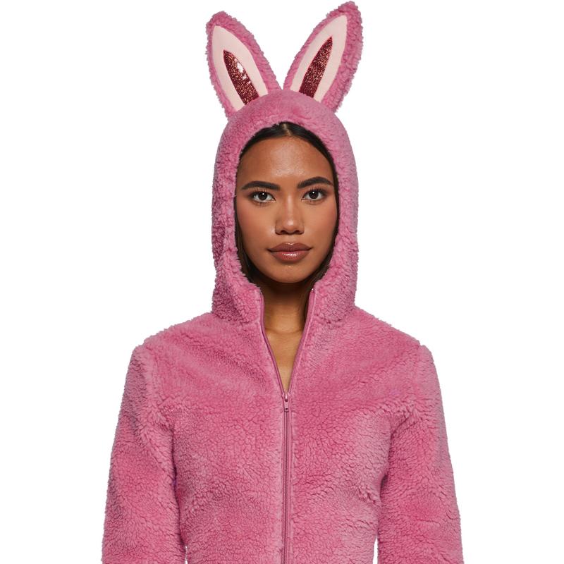 This romper has a faux fur construction,long sleeves, an atttached hoodie with vinyl glitter bunny ears on top, and a front zipper closure.