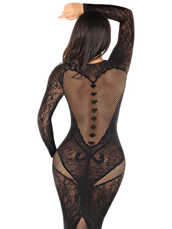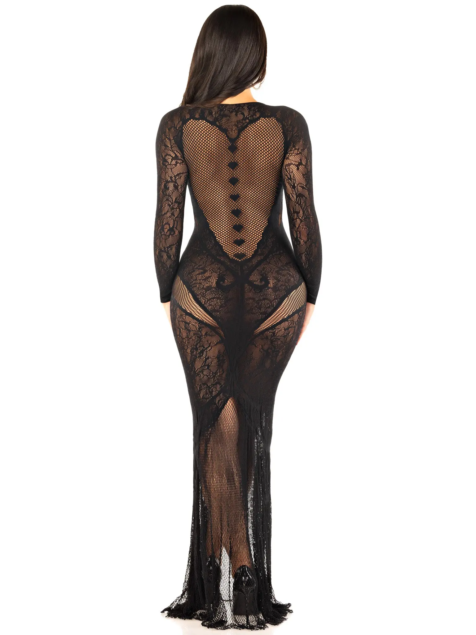 Let your curves do the talking in this jaw-dropping lace lingerie dress by Leg Avenue. With a stunning body-con silhouette, this lace and net gown features a front and back heart detail that is sure to get pulses racing.