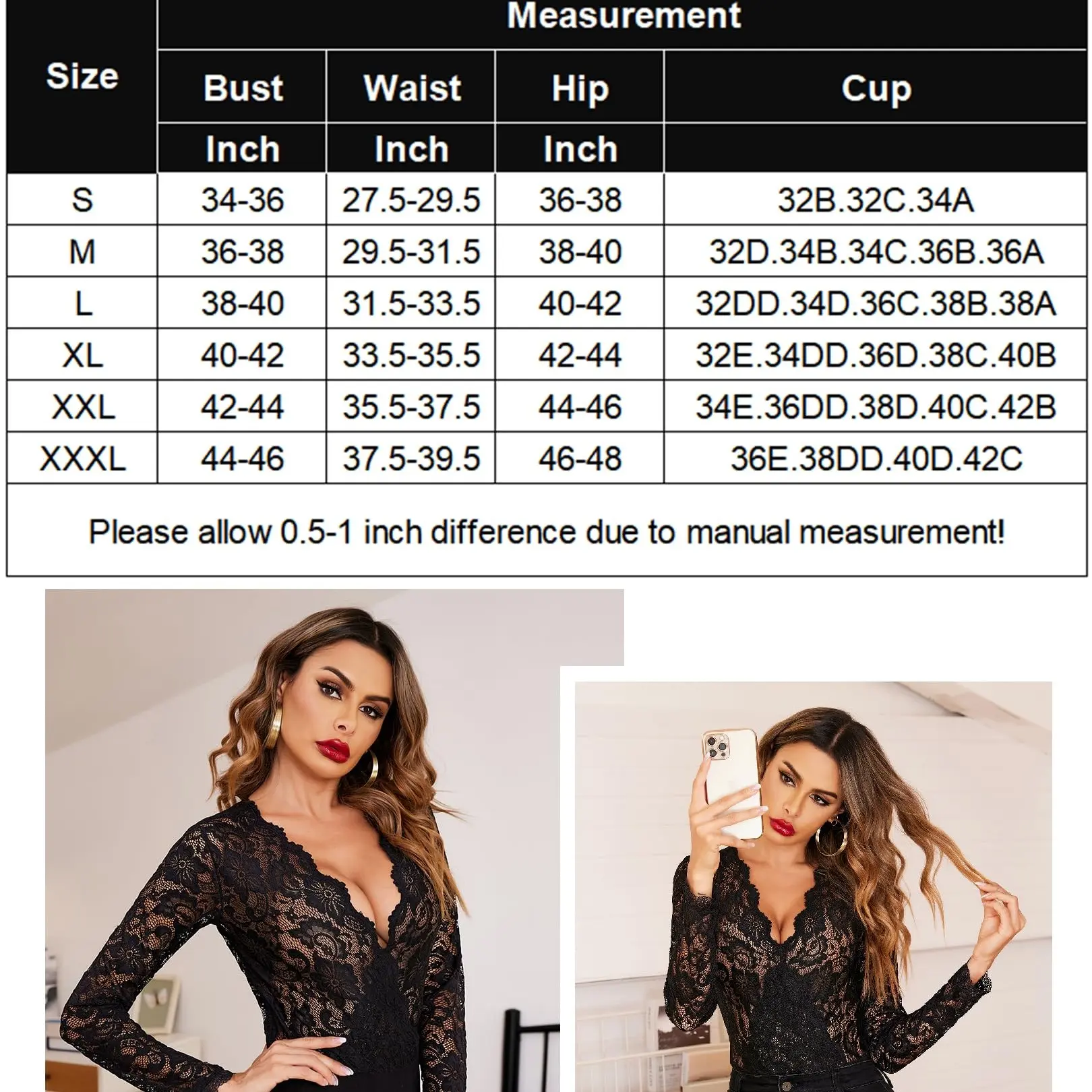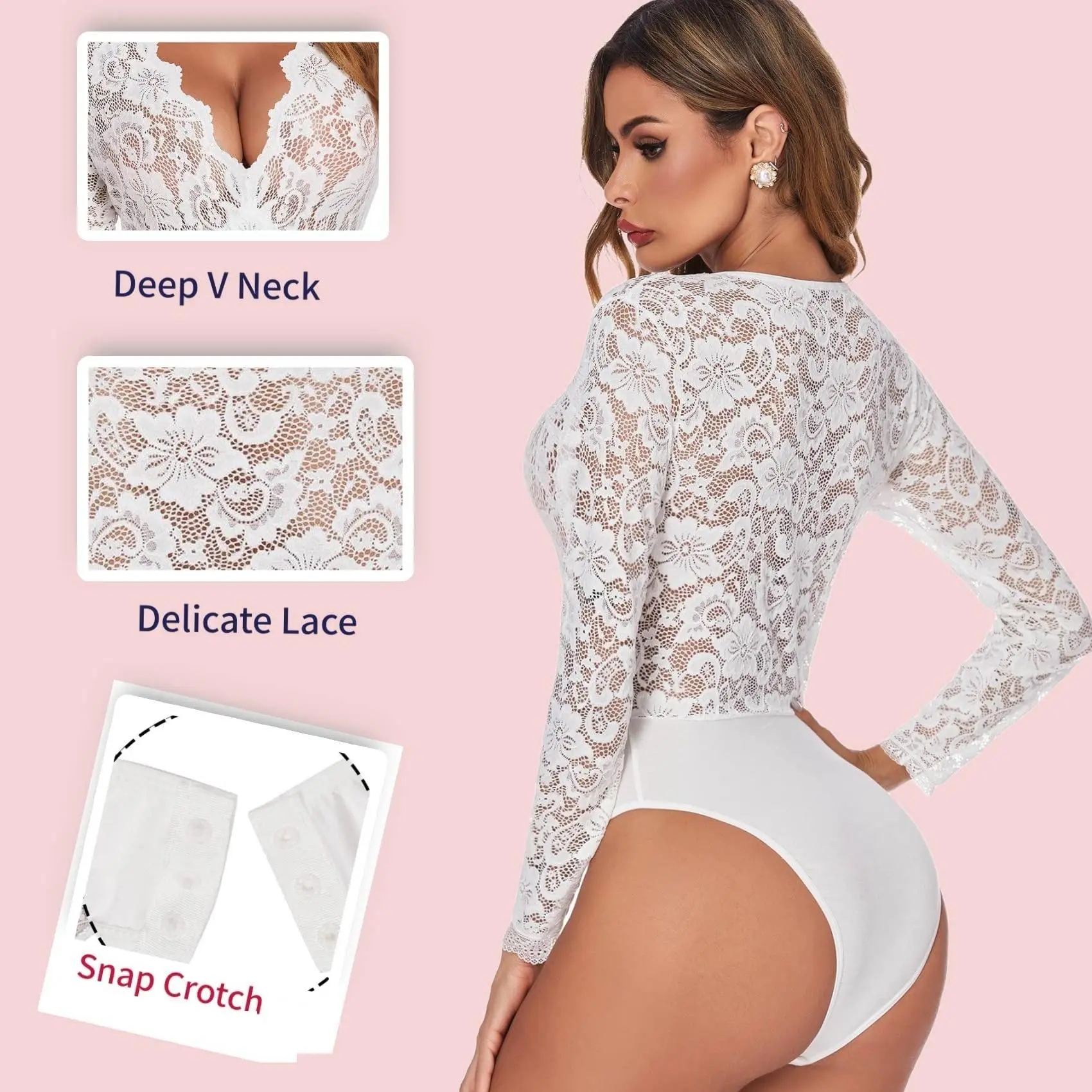 ·Feature: Long sleeve lingerie bodysuit features a very plunging V neck, floral scalloped lace on bust, bodycon style show off your flattering curve. snap crotch design is easy to put on or take off