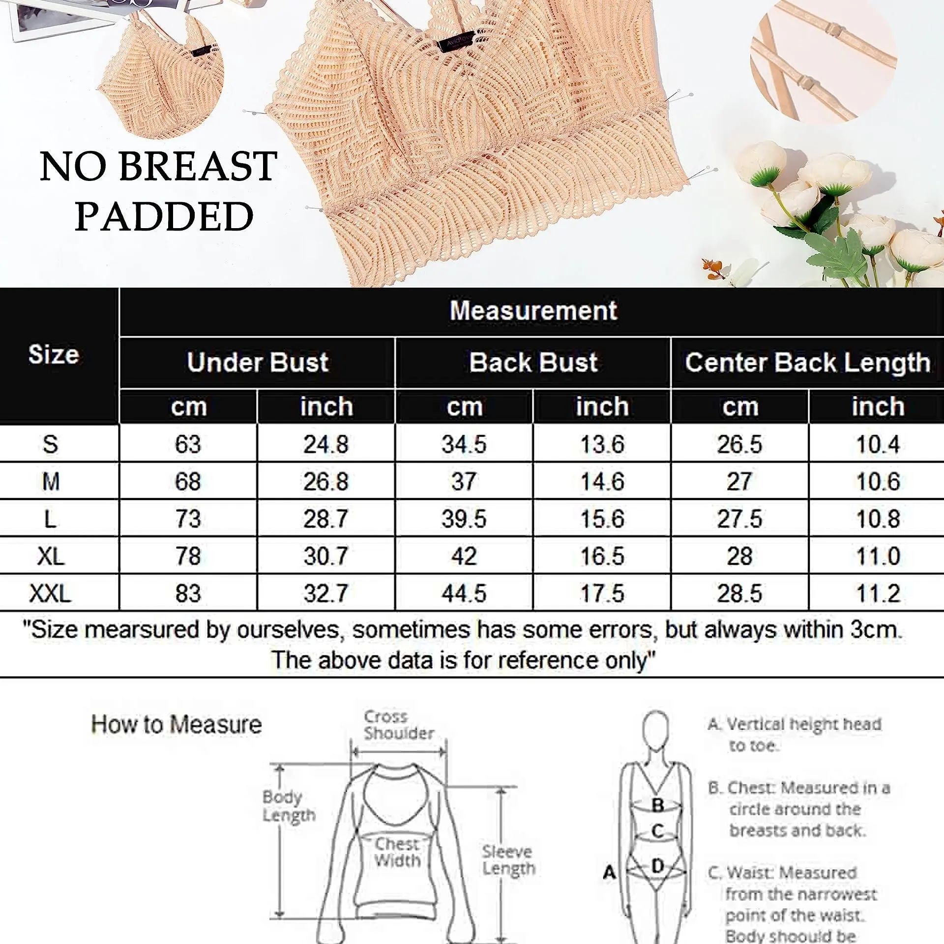·The soft, stretchy, and comfortable support band and adjustable thin straps are suitable for AC cup sizes.