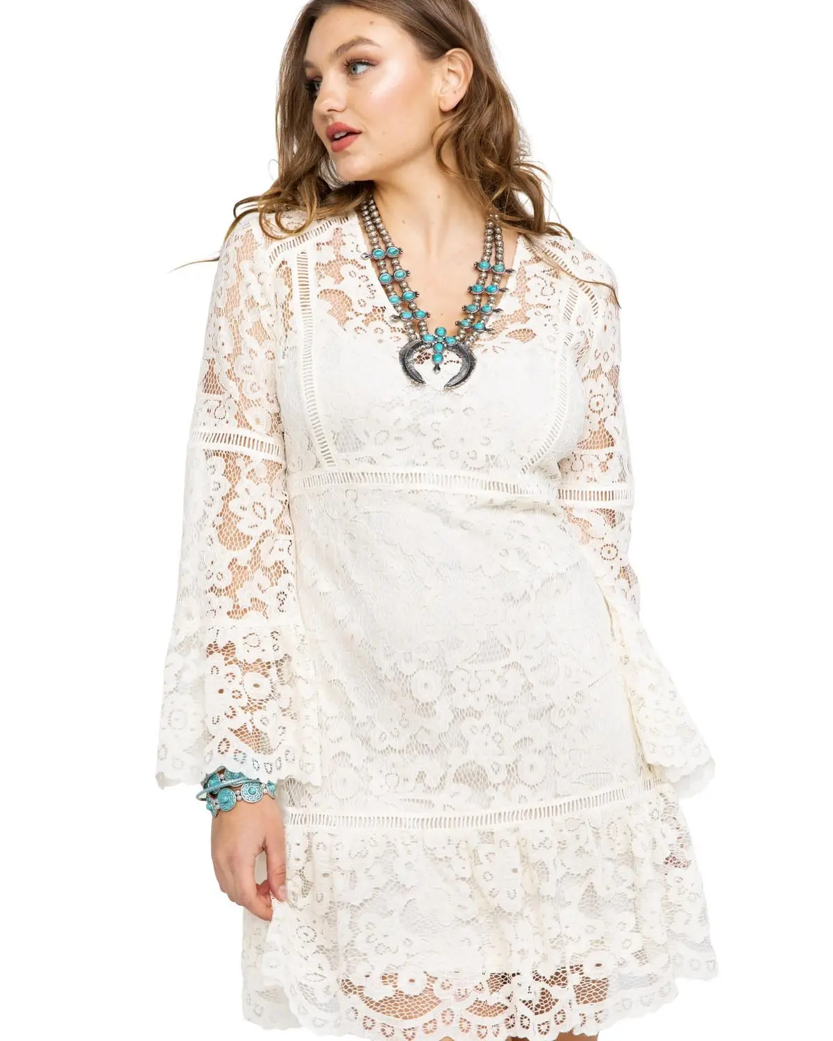 Cotton blend lace detailing. Long sleeve. Scoop neck. Scalloped edge bell sleeves and hemline. Two piece with separate lining. Falls above the knee. Machine wash cold.