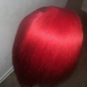 My 613 wig was turned into a truly, ruby red wig. It was my first time water dying a wig and I loved everything about it. The shedding was minimal, the color didn’t bleed through, it held a good curl and flat iron on its highest heat setting. True to length, mostly on the back side, it’s layered a little more on the sides and front.