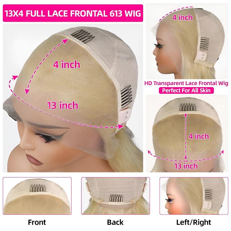 ·【Medium Size Cap】:613 Blonde Lace Front Wig Human Hair,22.5 inch medium cap size with 2 adjustable straps and 3 combs, perfectly combined with your head,provide you with more convenient and comfortable wearing experience.