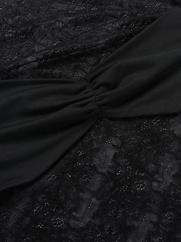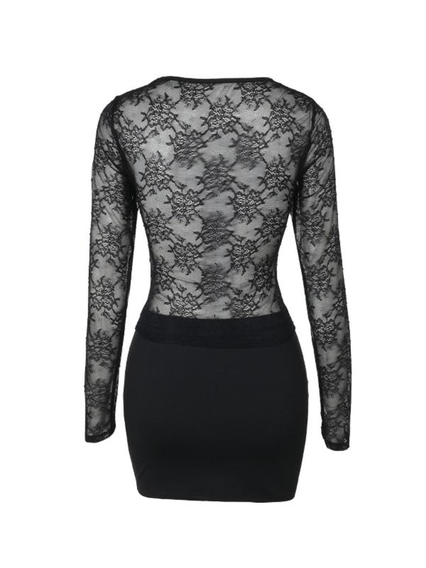 This two-piece set features a long-sleeved round-neck lace sheer top that is light and dreamy, paired with a playful short skirt, effortlessly capturing both sophistication and sexiness.