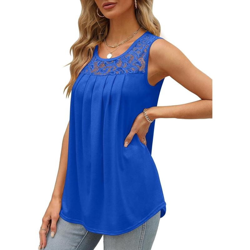 5. WIHOLL Summer Tank Tops for Women Loose Fit Pleated Tunics Scoop Neck Sleeveless Lace Tops Curved Hem Flowy Blue Feminine