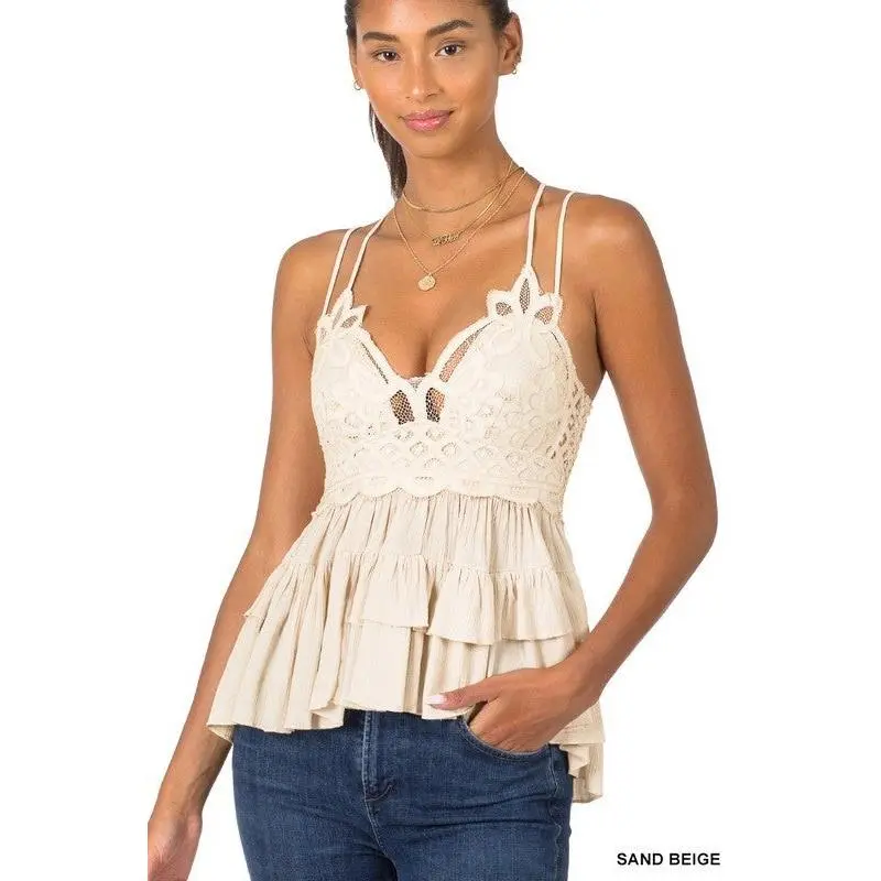 The Mocha Lace to Finish top has a ruffle that is torn. I just received the package the plastic bag was torn on one side and had tape closing the other side.
