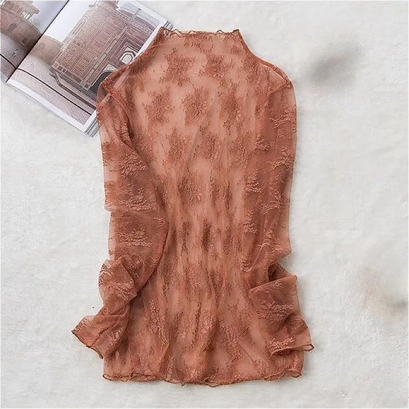 Lace Undershirt for Women 2025 New Style Semi High Neck Shirt Mesh Long Sleeved Sexy Top