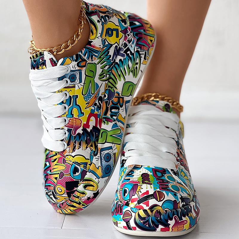 These sneakers feature a unique lace-up front design, perfect for a secure fit. The platform style adds a modern twist to your wardrobe. Ideal for casual outings or light activities, they blend comfort with style. The painting print adds a touch of creativity to your look.