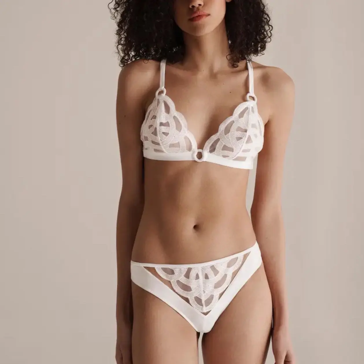 Looking for an elegant and comfortable bralette that oozes femininity and style? Look no further than the Adele Embroidered Lace Bralette! Available in two captivating colors - Elegant White and Mysterious Black - this bralette is the perfect addition to your lingerie collection. Made with intricate lace detailing and delicate ring details on the shoulder straps, Adele Bralette emanates sophistication. The triangle-style design offers a flattering fit that complements natural shaping, while fully adjustable shoulder straps ensure a personalized fit. The non-padded cups provide natural support while also offering maximum comfort.