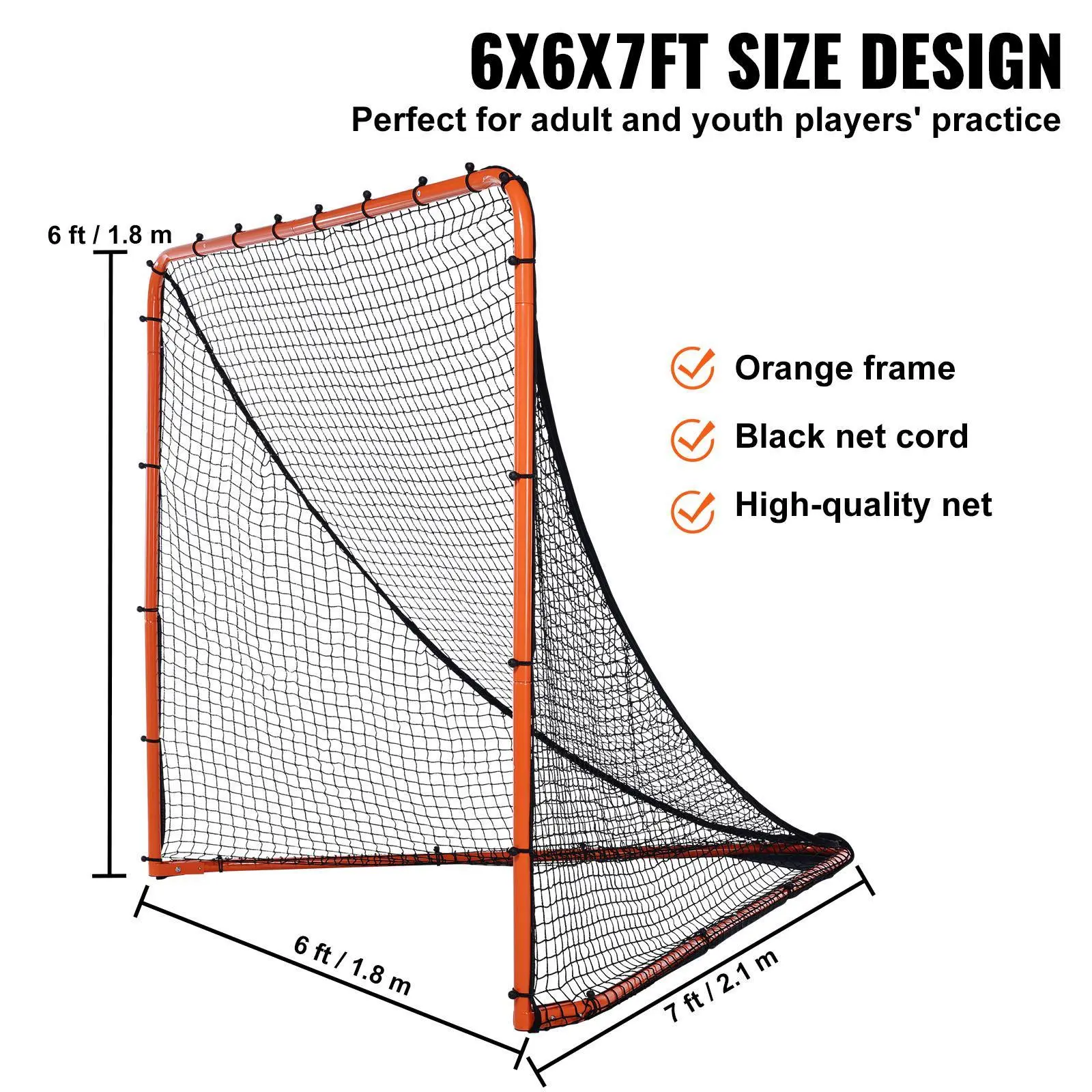 • 6x6x7ft: This lacrosse training equipment has overall dimensions of 6x6x7ft, including both the frame and the net. It is ideal for adult and youth players' training. It also perfectly matches other equipment or facilities that meet the same standards, ensuring compatibility with various gear and locations.