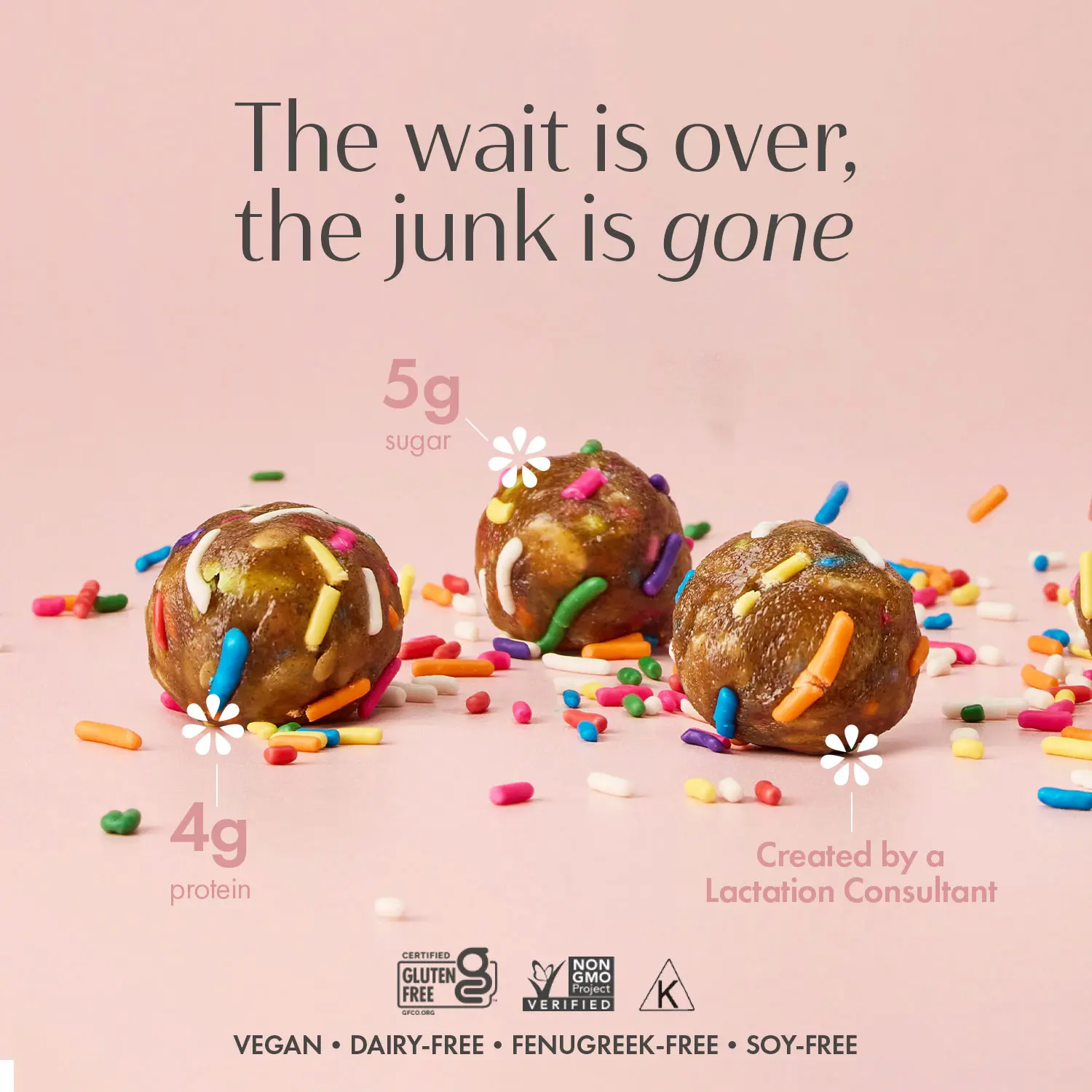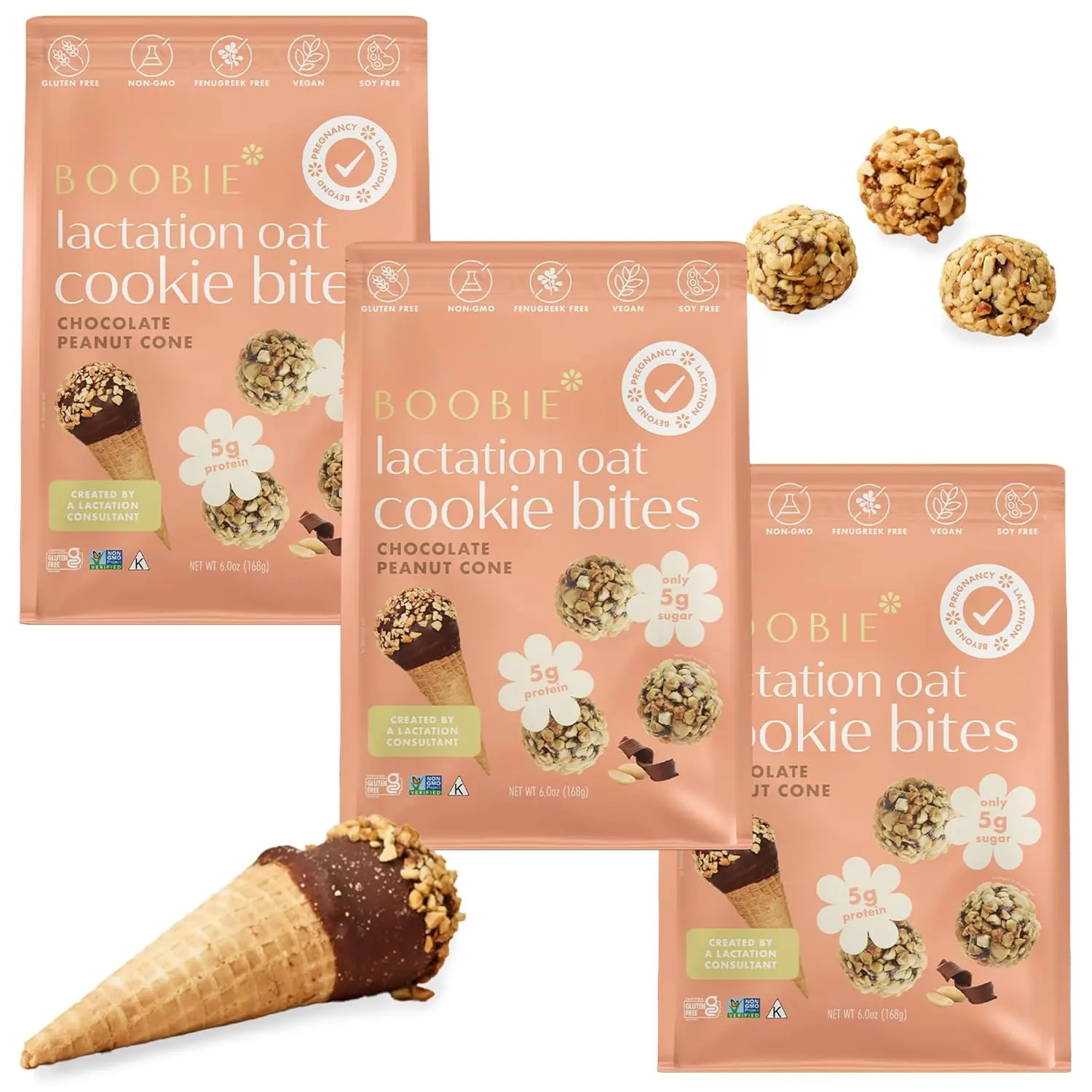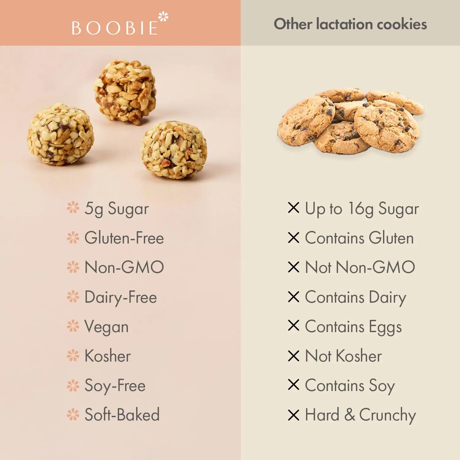 What Makes Boobie's Lactation Cookies Different: Boobie Lactation Cookies are 1/3 the sugar of leading lactation cookies, certified Gluten-Free, certified Non-GMO, Soy-Free, Kosher, Dairy-Free & Preservative-Free. They have no dairy, gluten, eggs, soy, fenugreek, brewer’s yeast, GMOs, artificial flavors or colors!