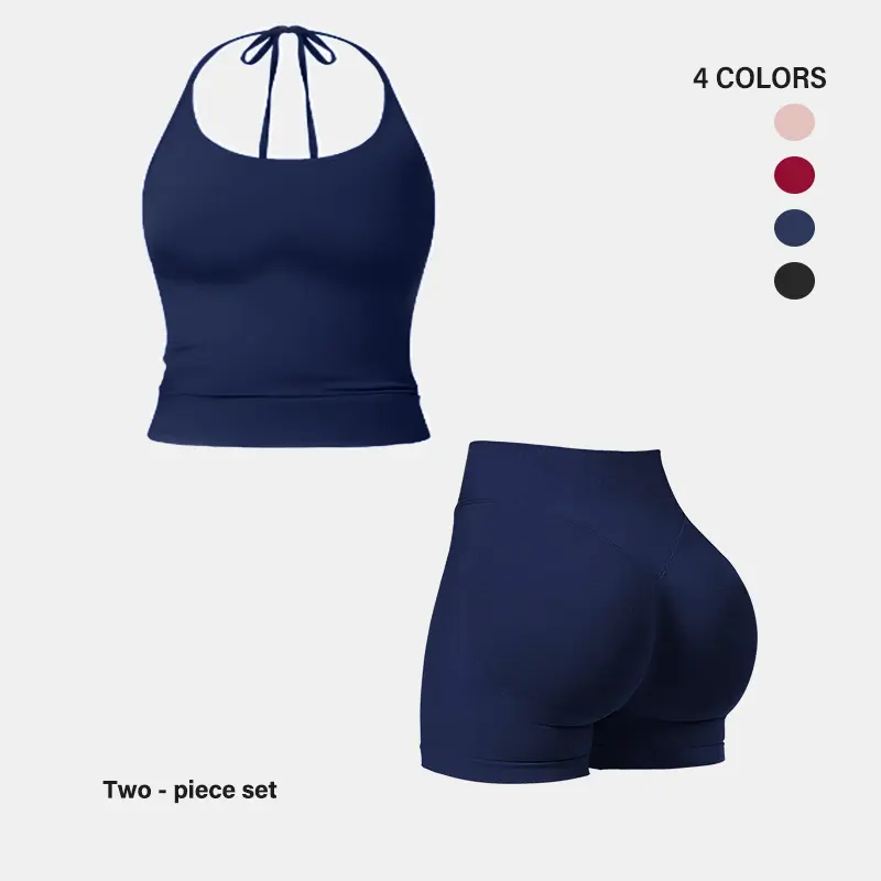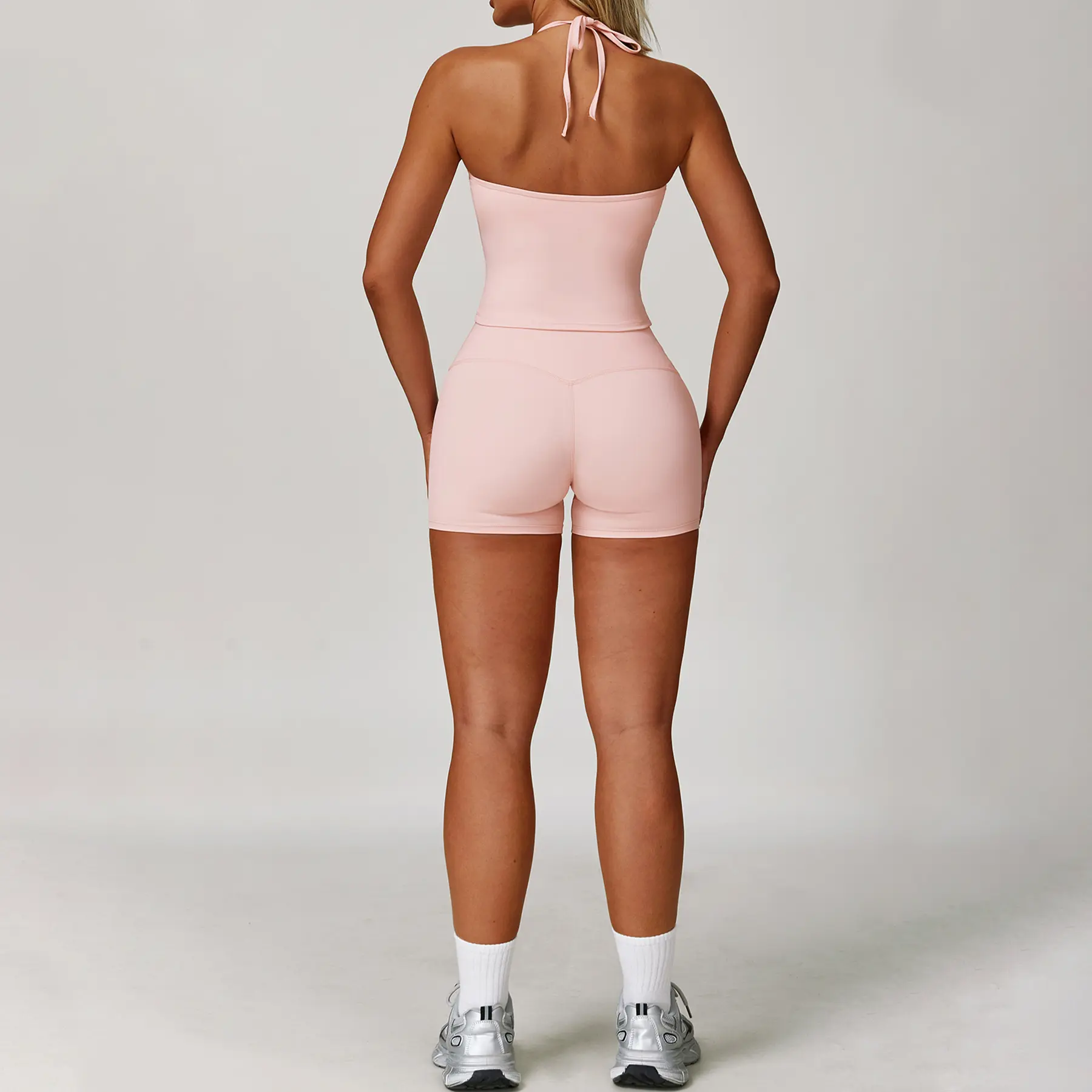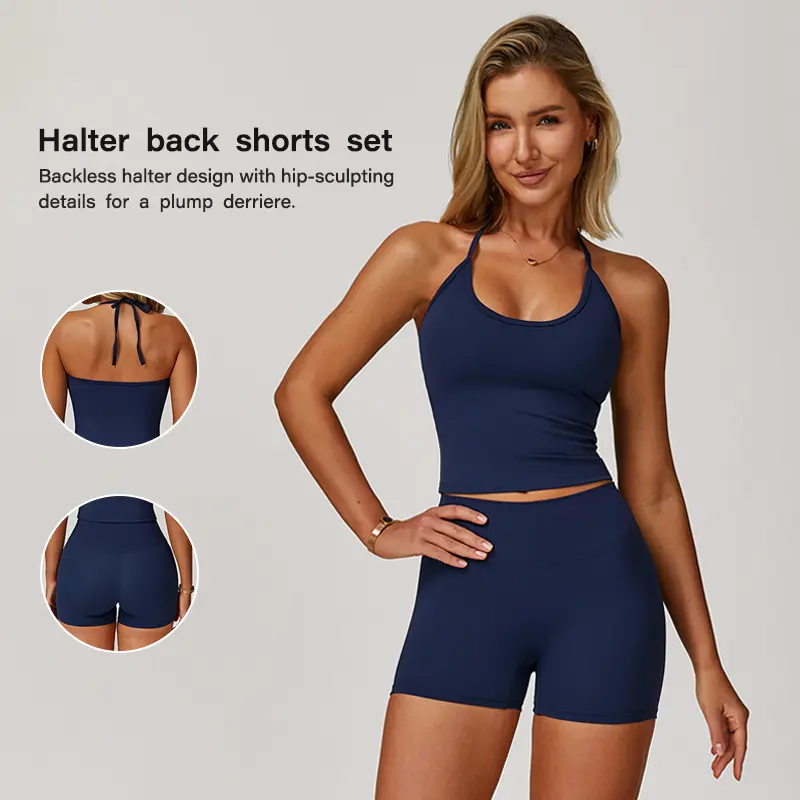 Top: Halter neck + open back shows off your shape. Slim hem cinches waist; removable lining goes from gym to street.