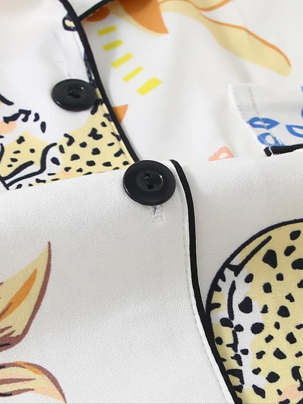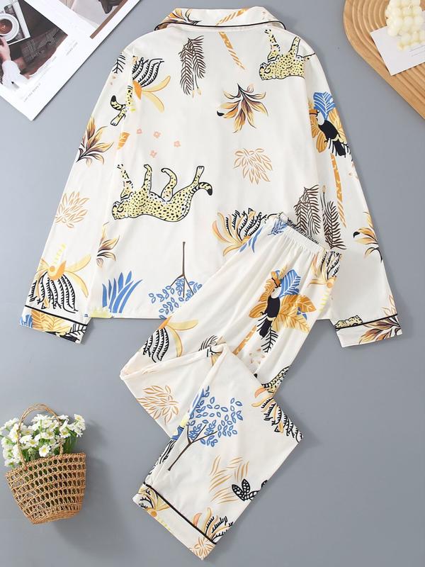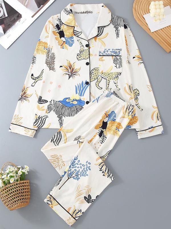 Women's Long Sleeve Pajama Set, 2-Piece Sleepwear Suit, Cartoon Animal Design, Leopard Pattern, All-Season Comfortable Loungewear