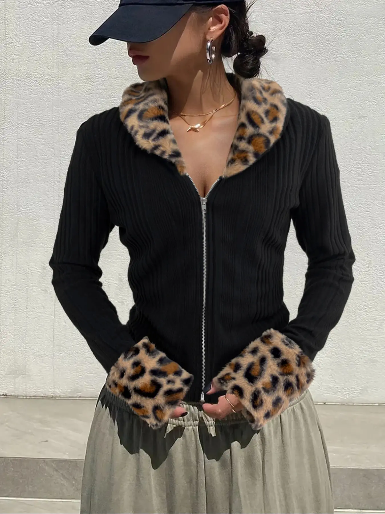 Ladies' leopard print fur collar & cuffs zipper jacket coat