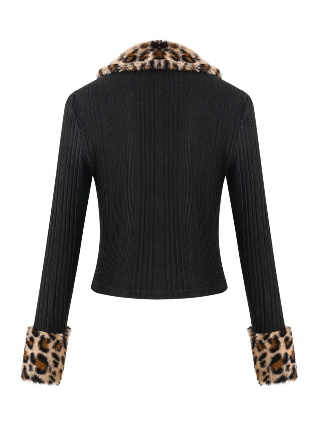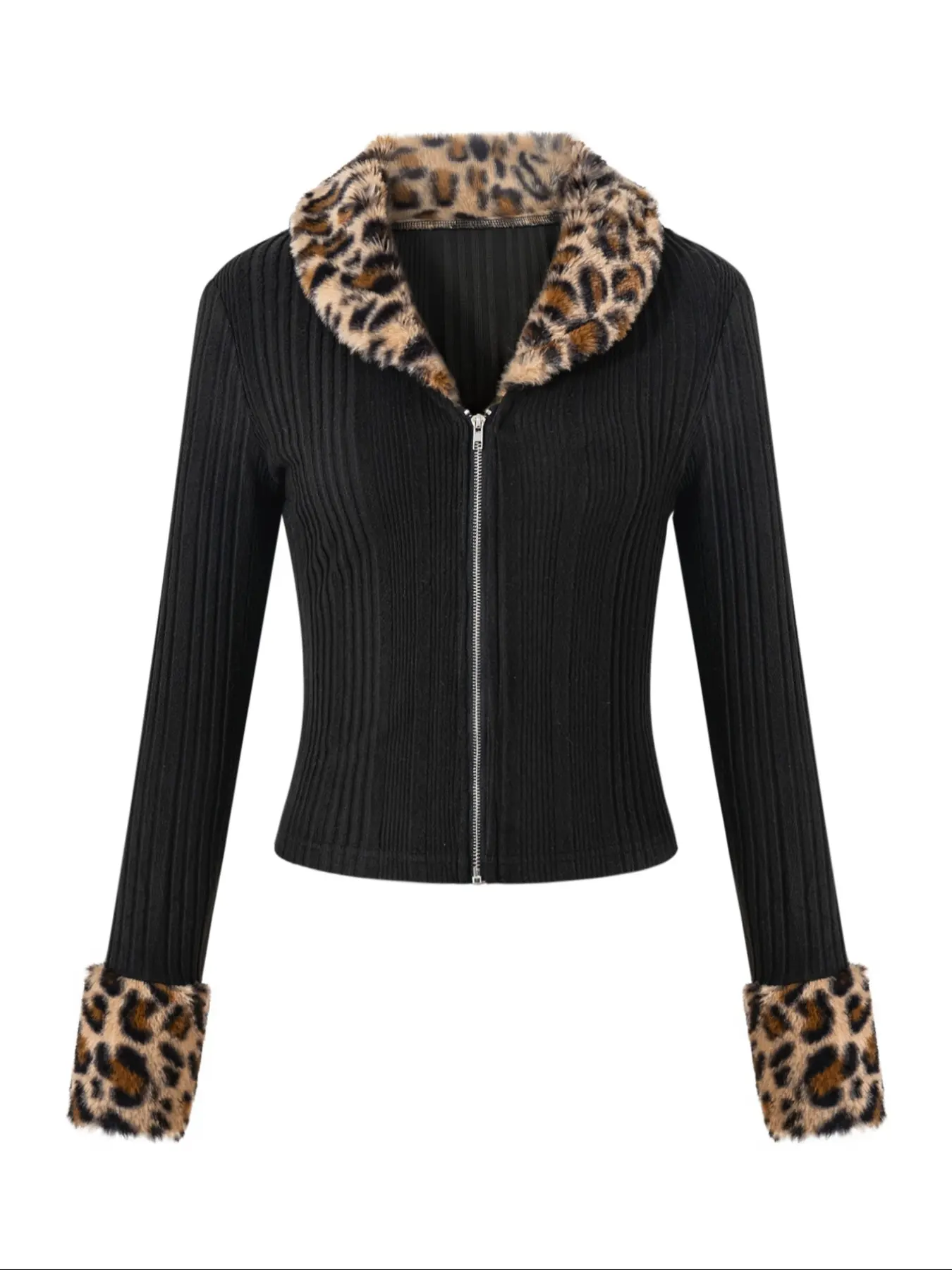 5. Ladies' leopard print fur collar & cuffs zipper jacket coat
