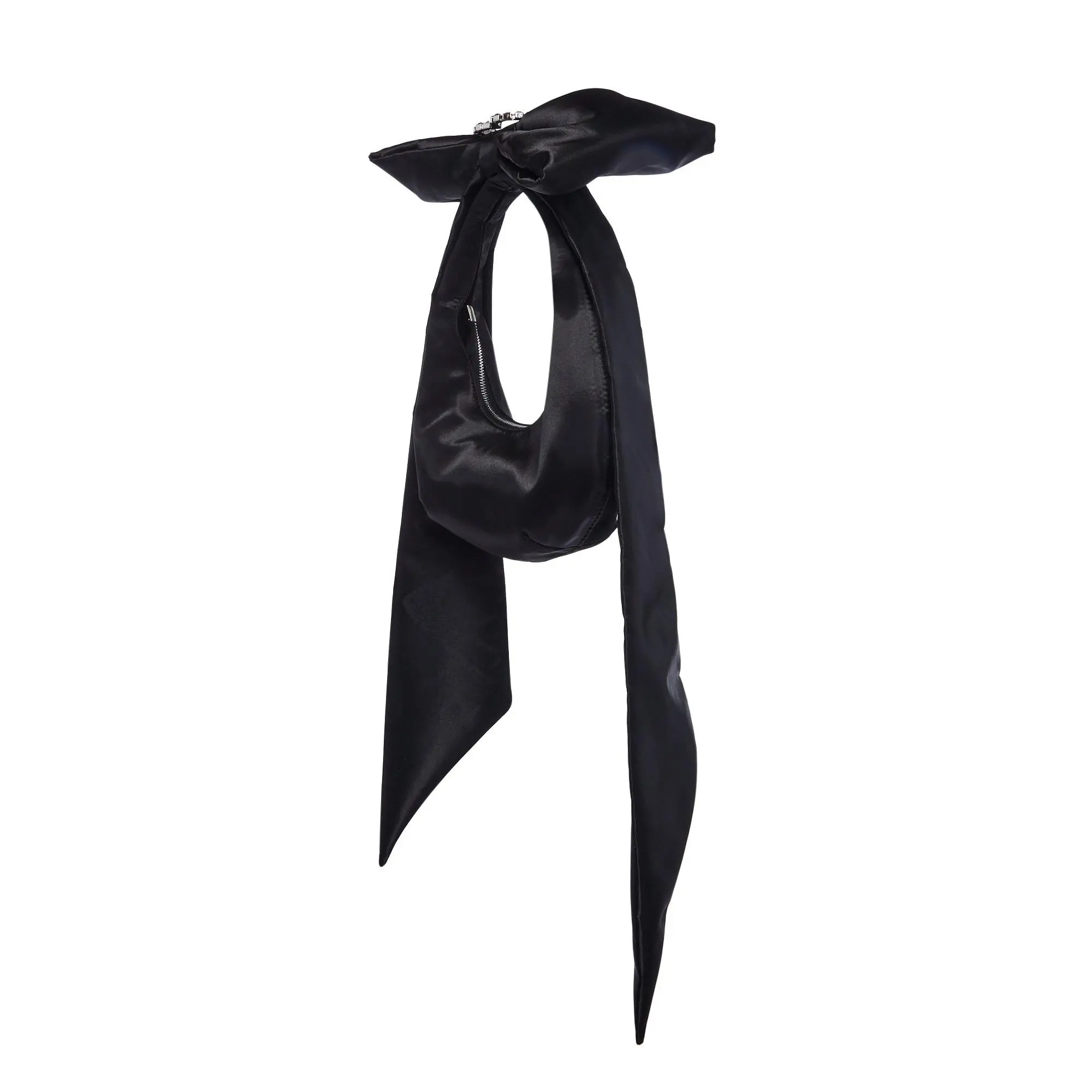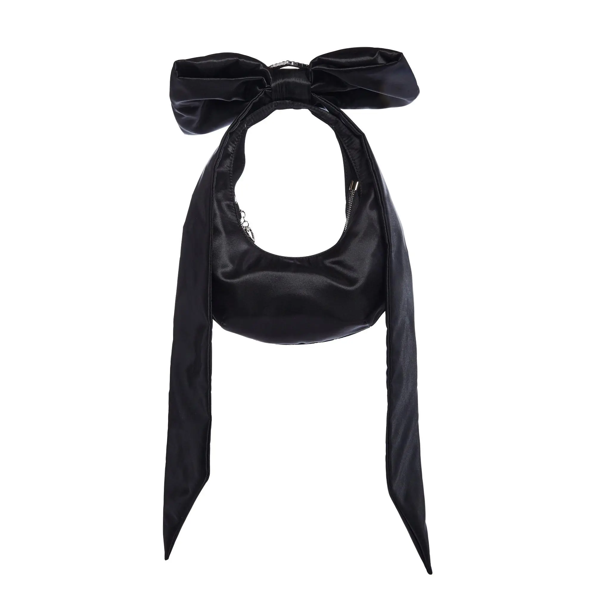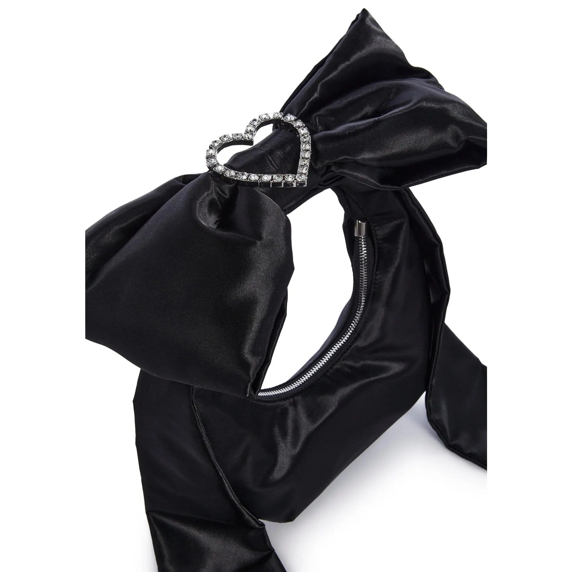 cuz everyone wants to be you. This bag has a satin construction, a ribbon handle with rhinestones, a centered heart adornment, and top zipper closure.