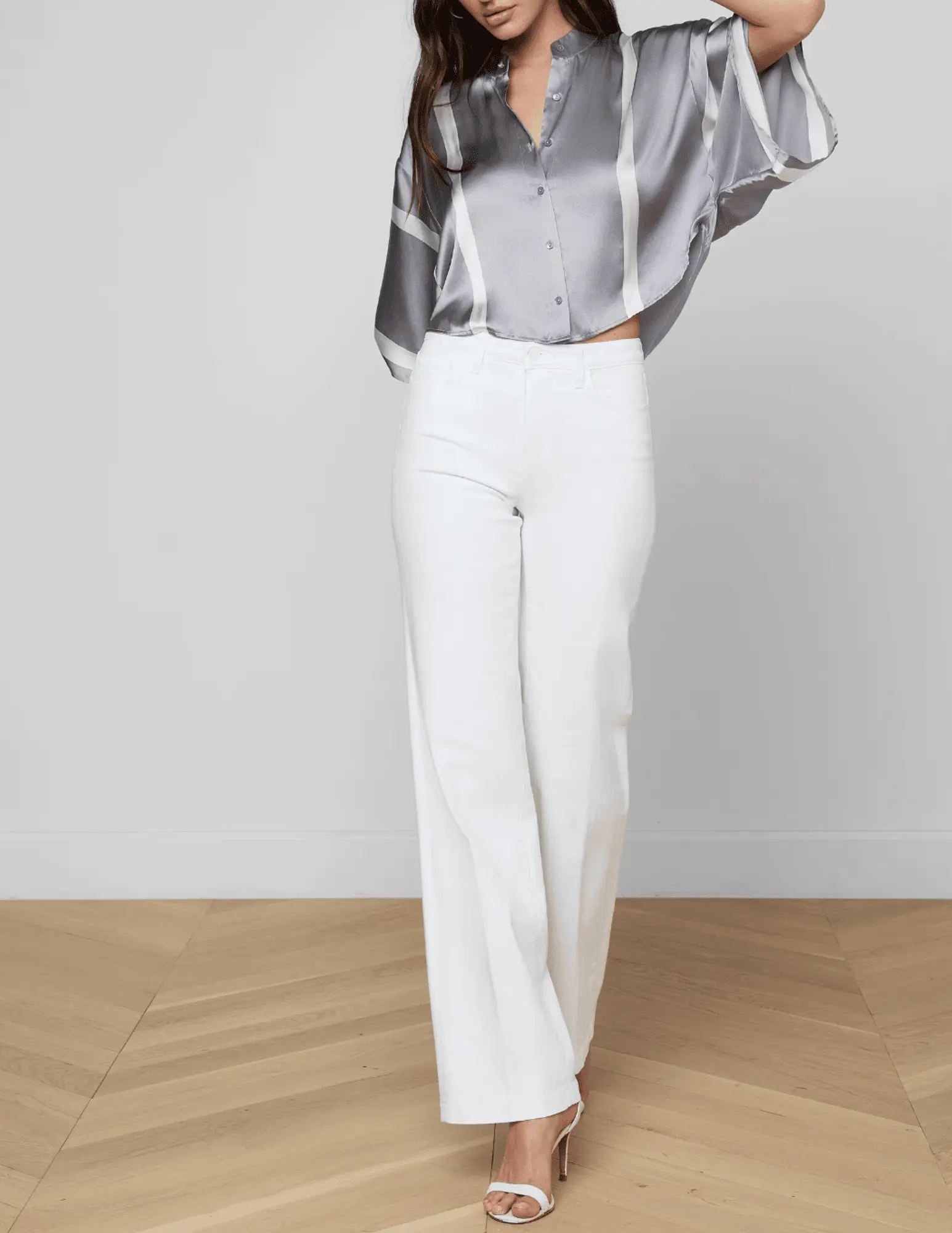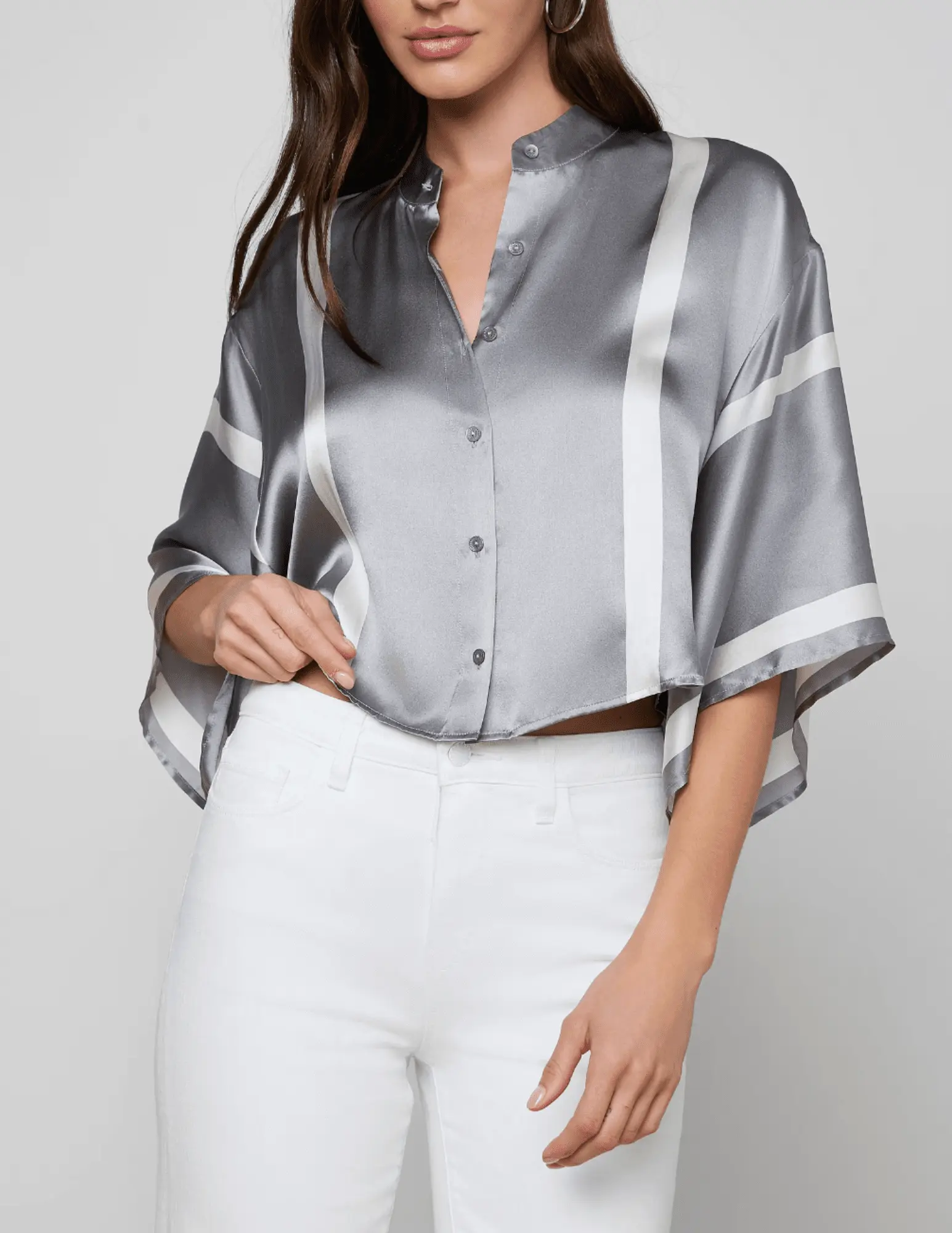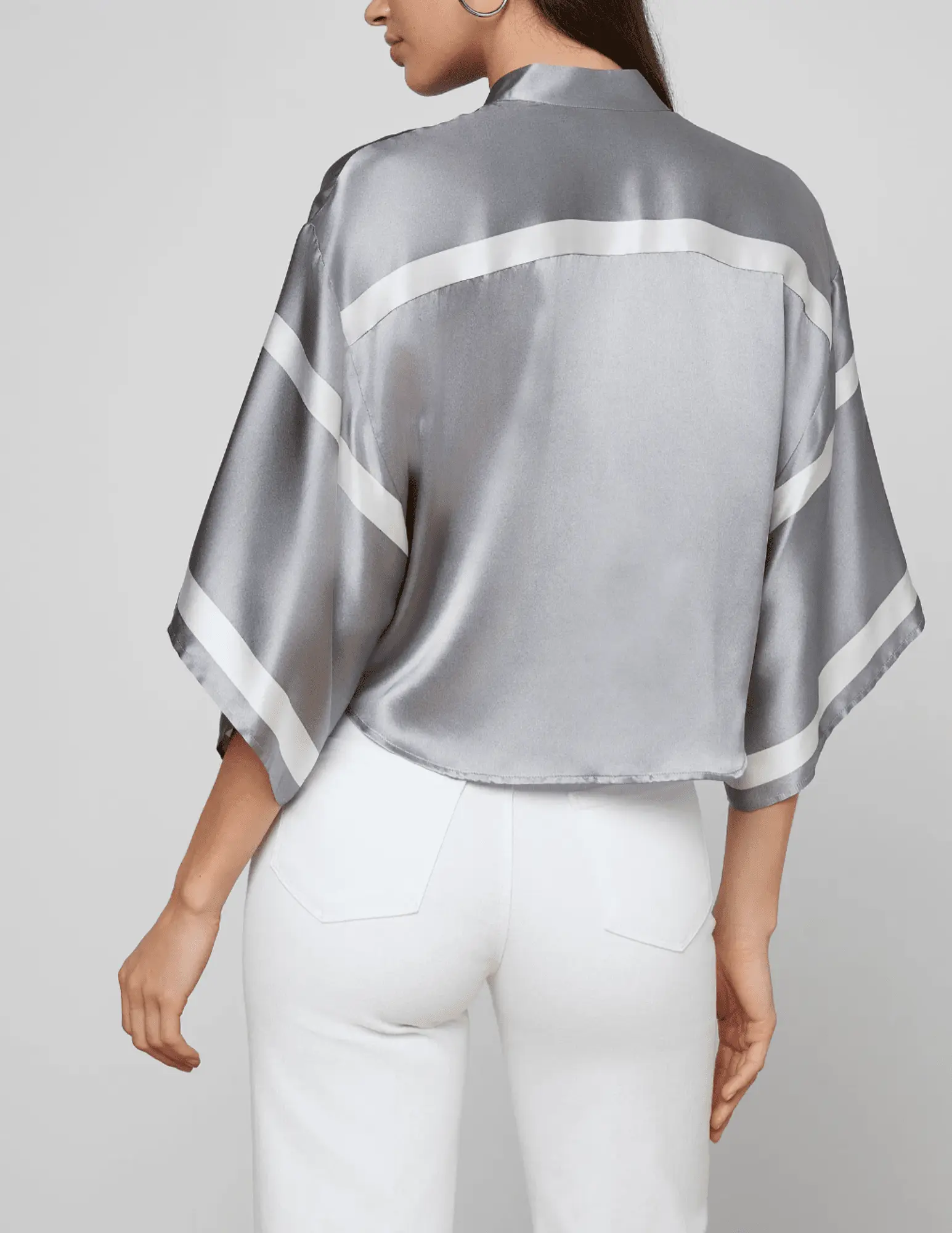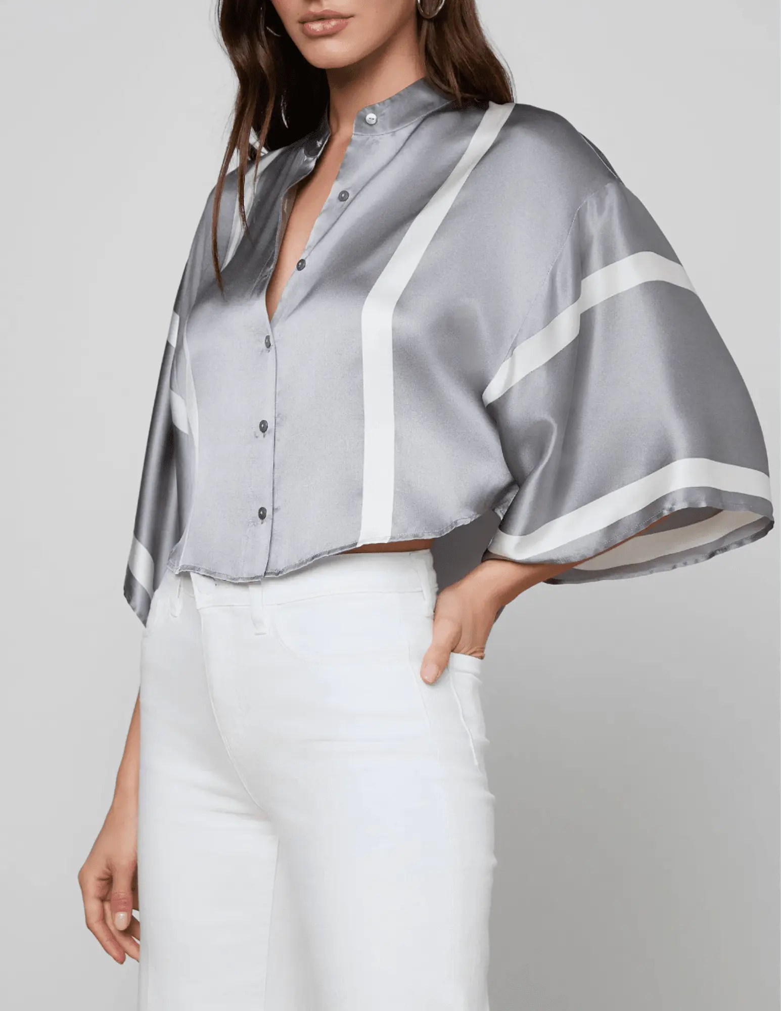 Modern polish meets effortless sophistication with the L’AGENCE Dru Cropped Blouse, a statement silk top designed to elevate everyday dressing. Featuring bold graphic striping and wide kimono-inspired sleeves, this blouse delivers a contemporary silhouette with a refined, luxury finish.