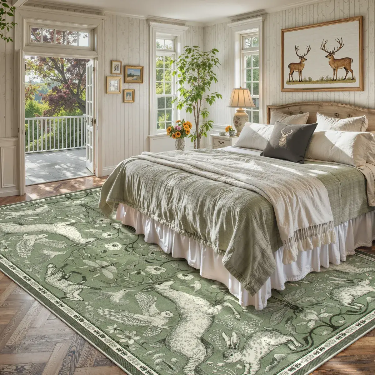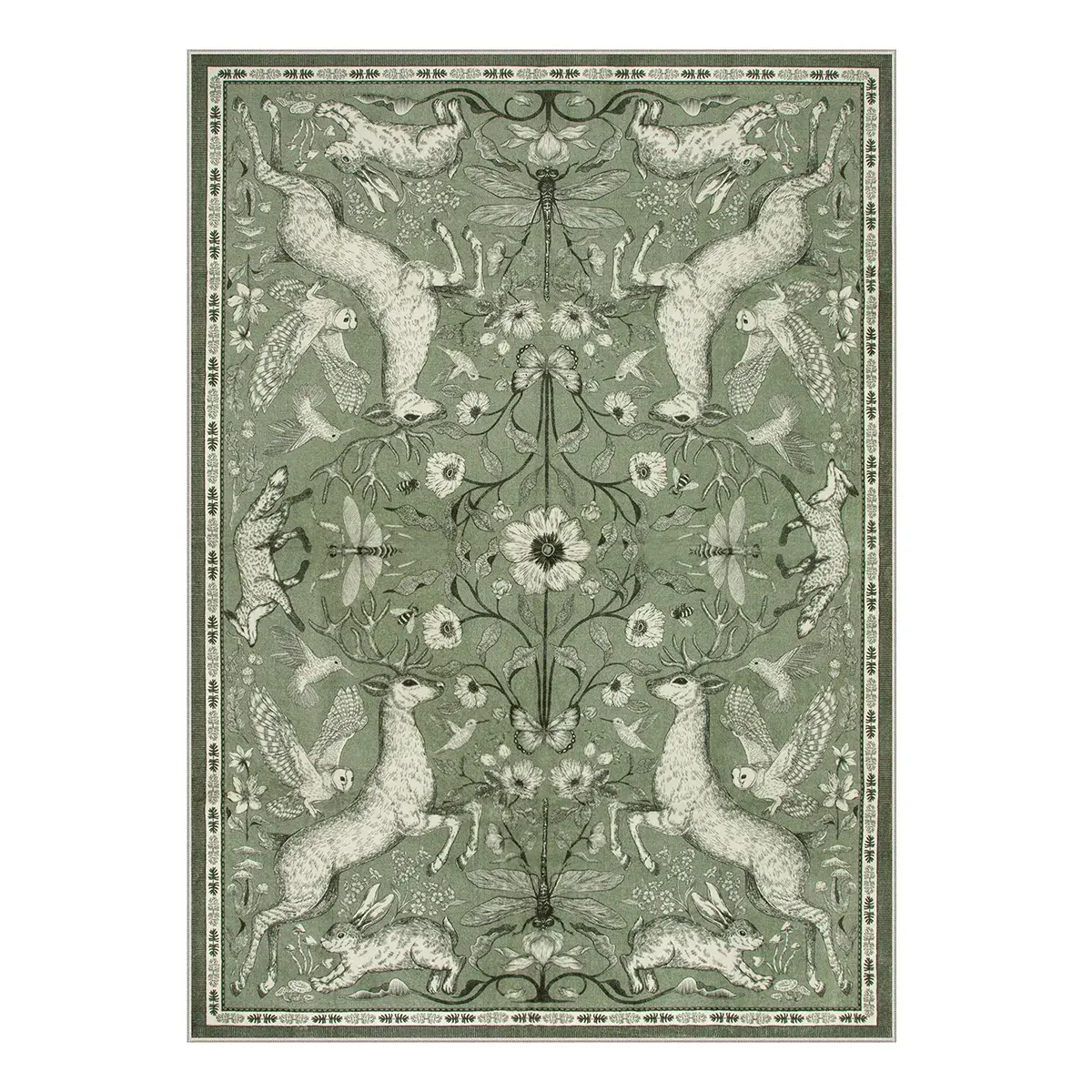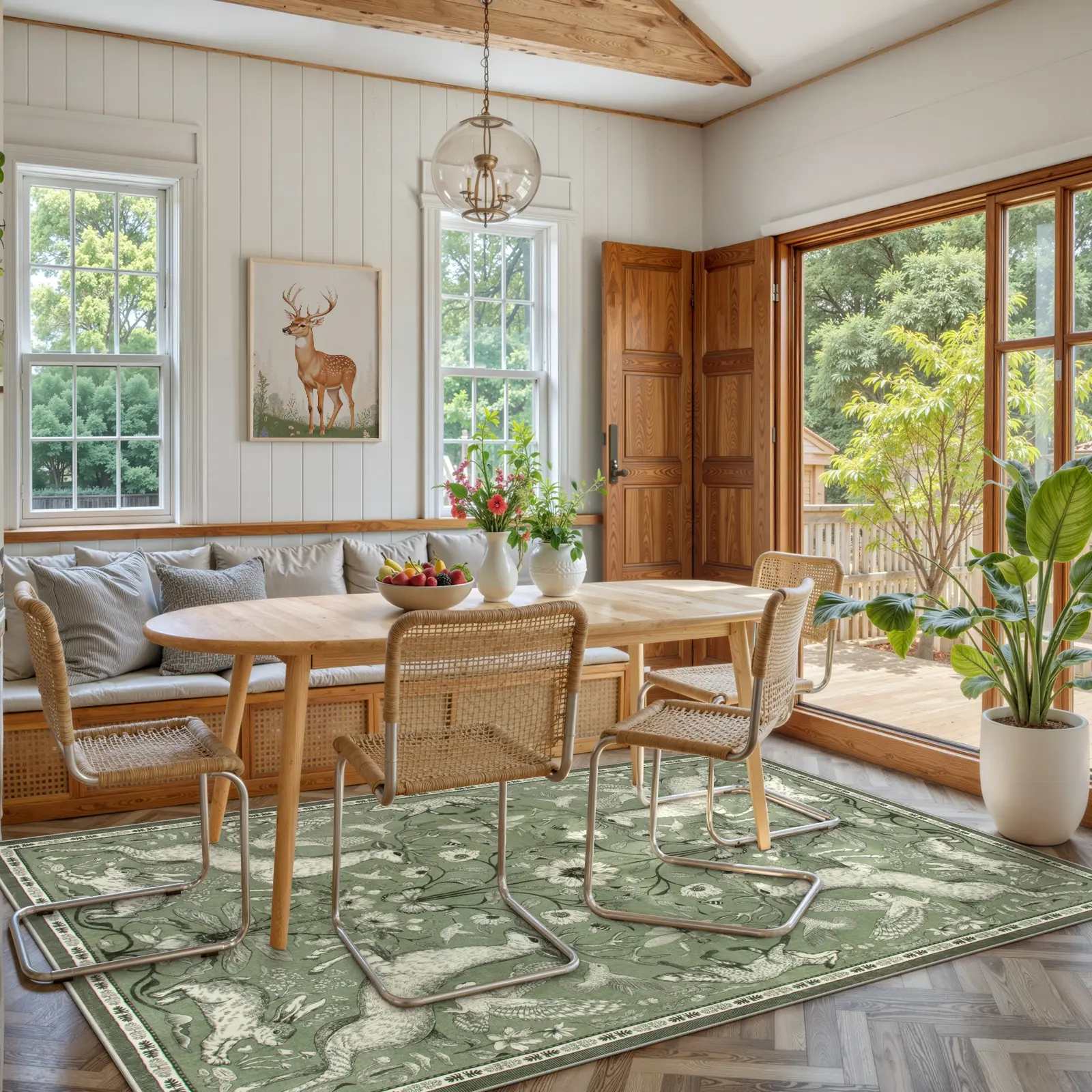 [Boho Animal Rug] - Inspired by pastoral scenes, this muted green rug features deer, rabbits, birds, dragonflies, foxes & flowers in intricate, symmetrical patterns. Delicate border adds charm, bringing nature indoors, add artistic flair to your home