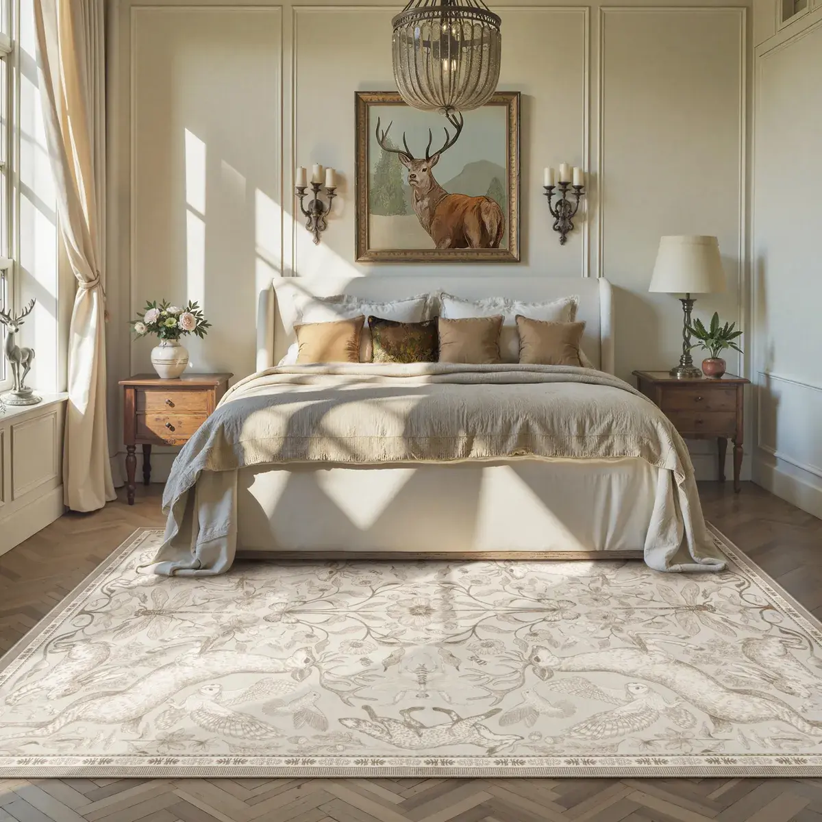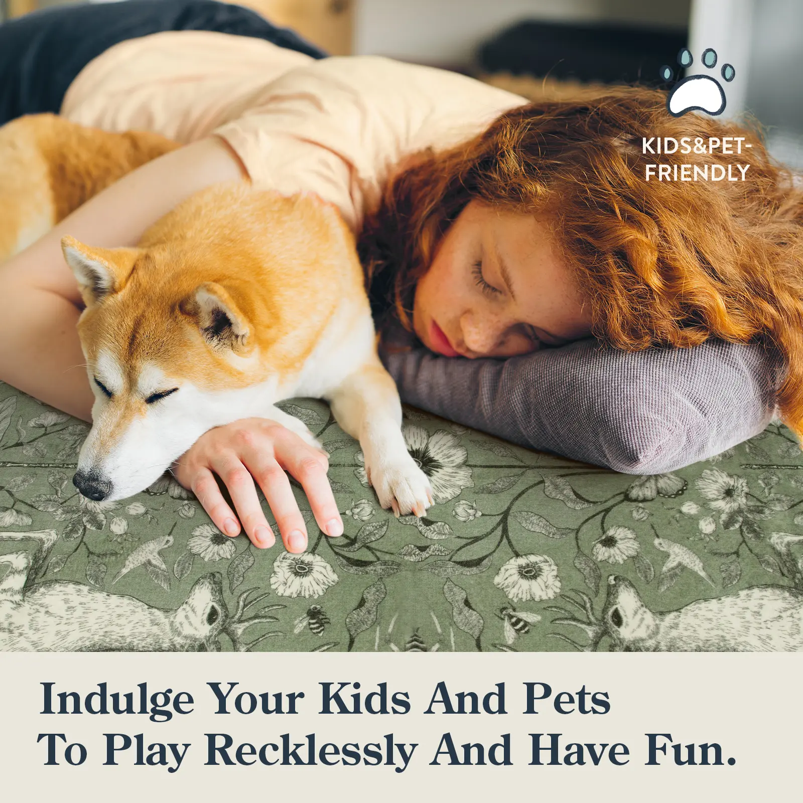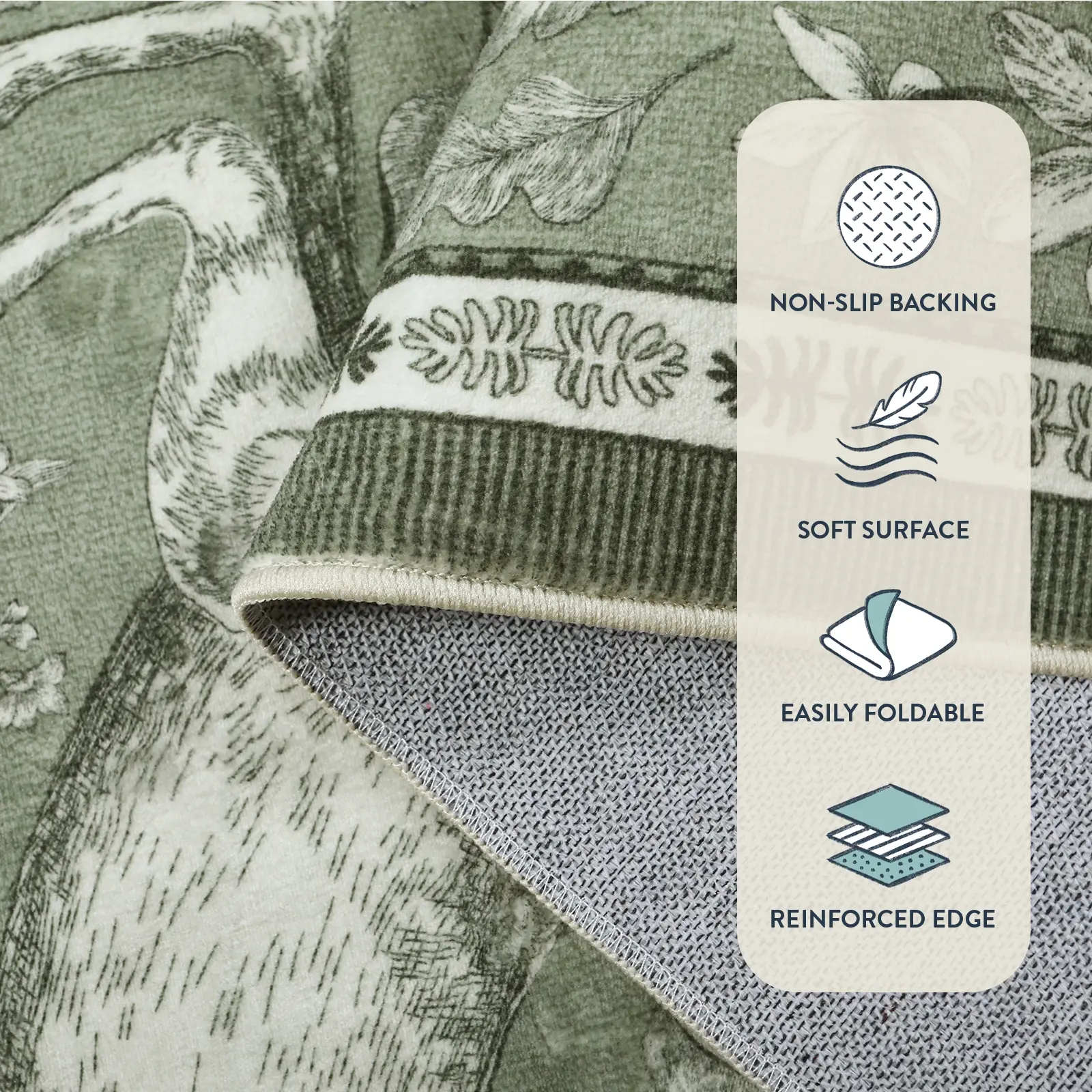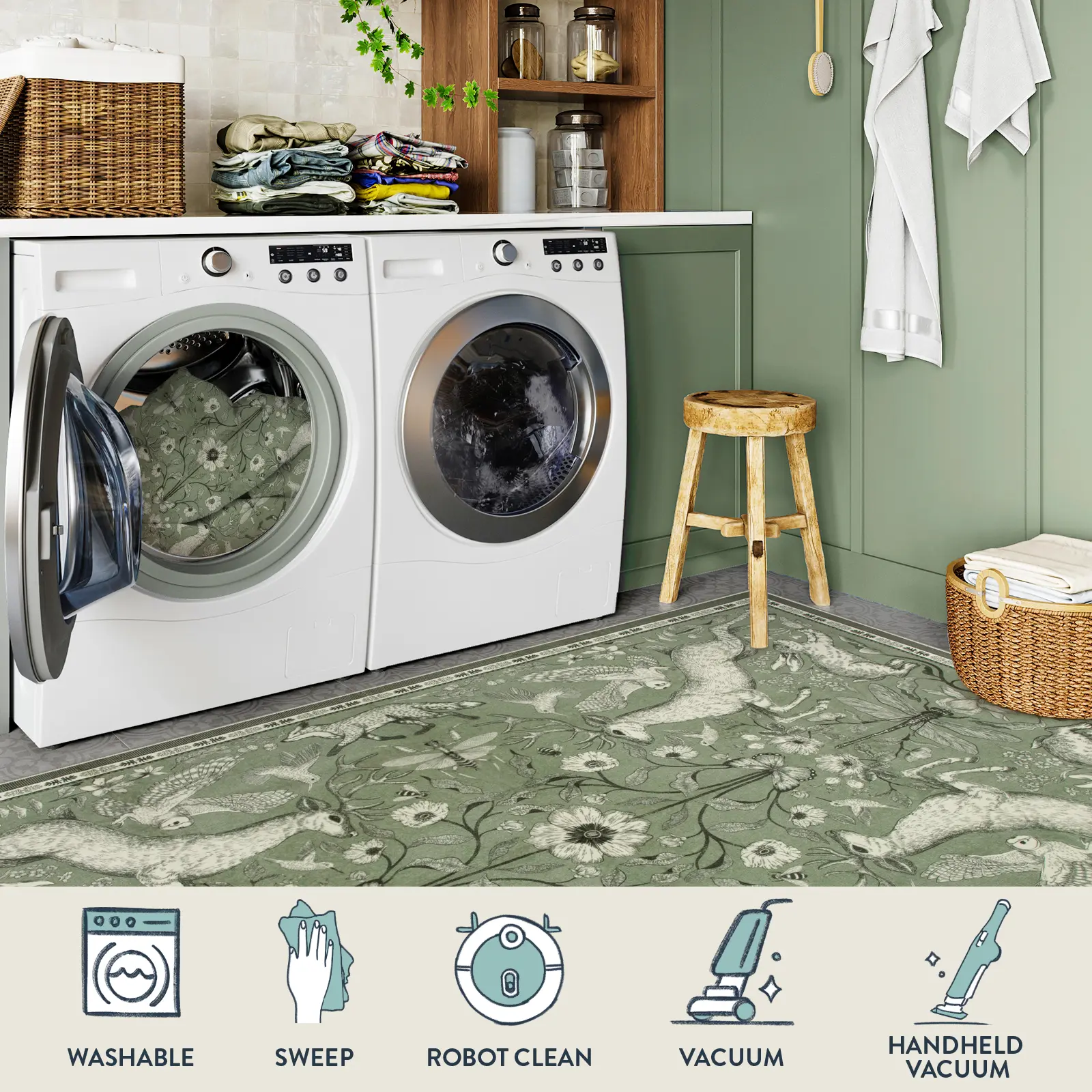 [Boho Animal Rug] - Inspired by pastoral scenes, this muted green rug features deer, rabbits, birds, dragonflies, foxes & flowers in intricate, symmetrical patterns. Delicate border adds charm, bringing nature indoors, add artistic flair to your home