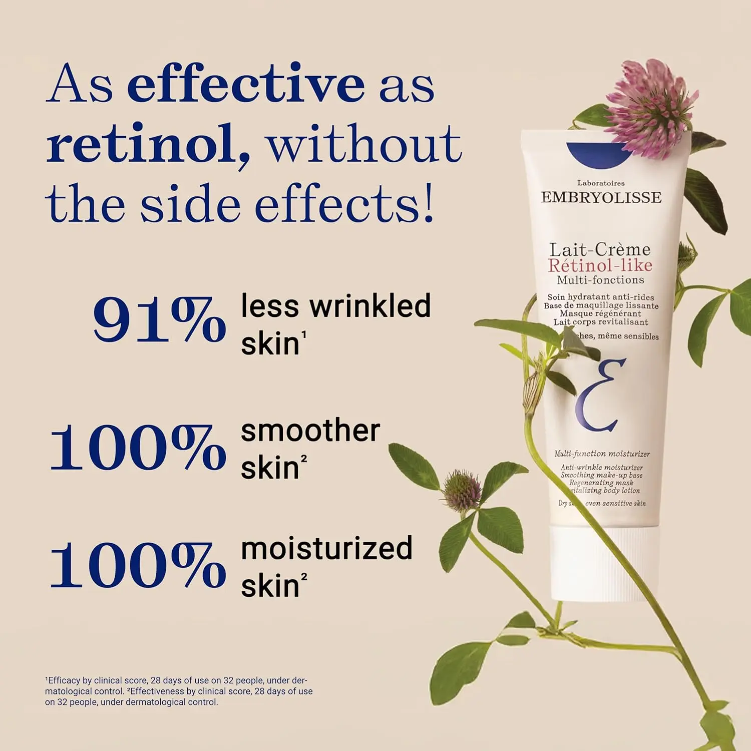 Discover Lait-Crème Retinol-Like, the first 5-in-1 multi-function anti-wrinkle skincare* with French Big Clover, a 100% plant-based Retinol-like** active.