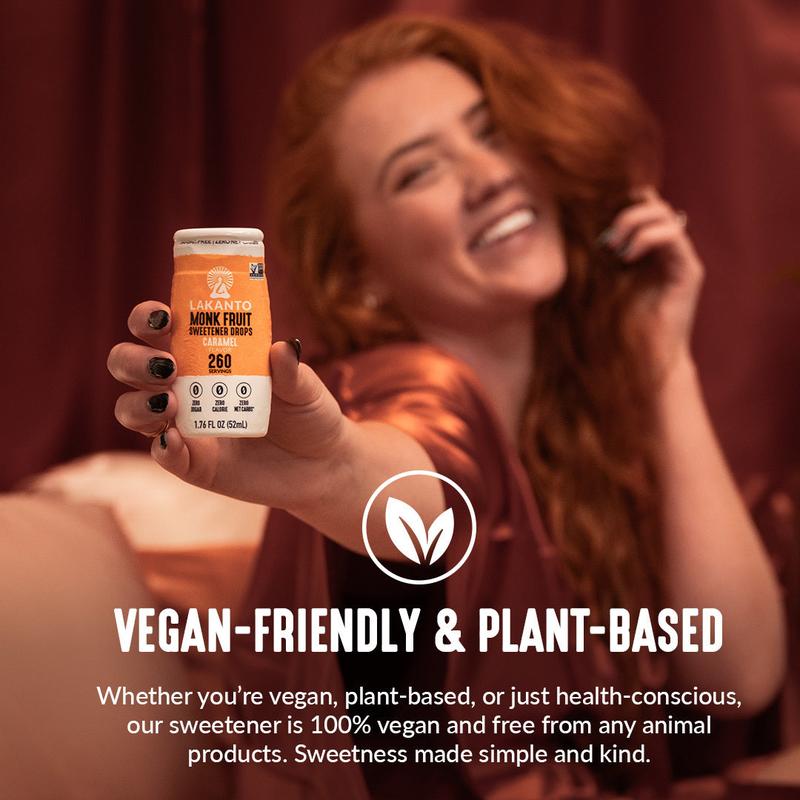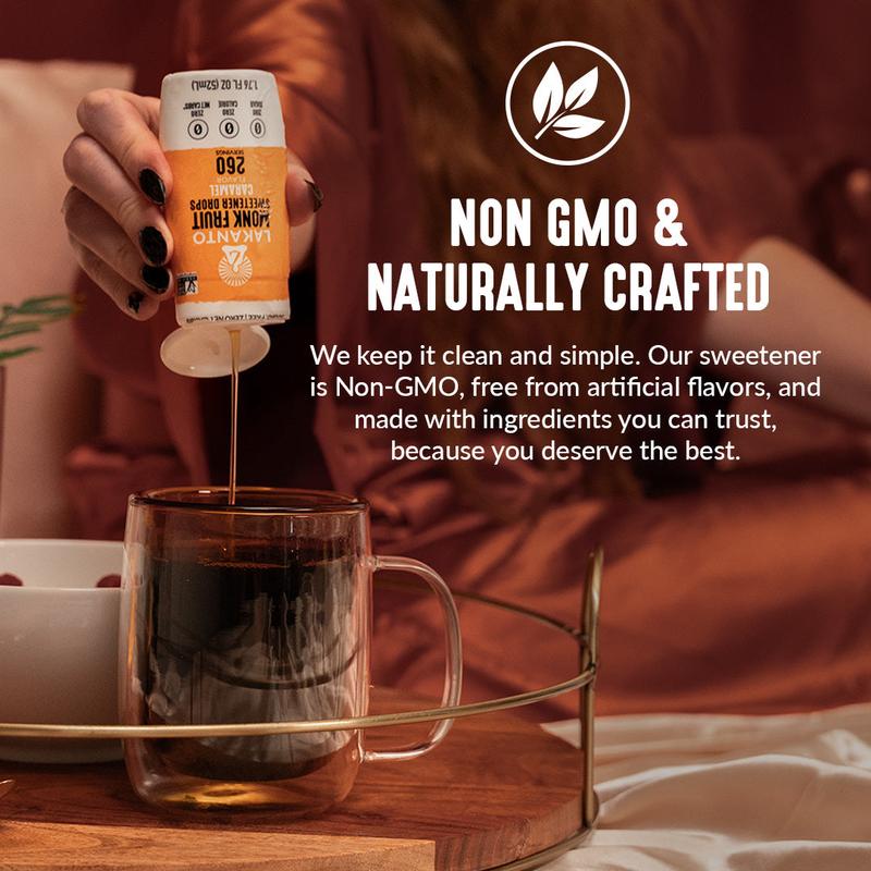 Our caramel sweetener drops give you all the rich buttery goodness of caramel without the added sugar. Lakanto Liquid Monkfruit Sweeteners provide a fast, easy, and convenient way to sweeten your drinks! With zero calories and a zero glycemic index, you can enjoy sweetness without the bitter aftertaste.
