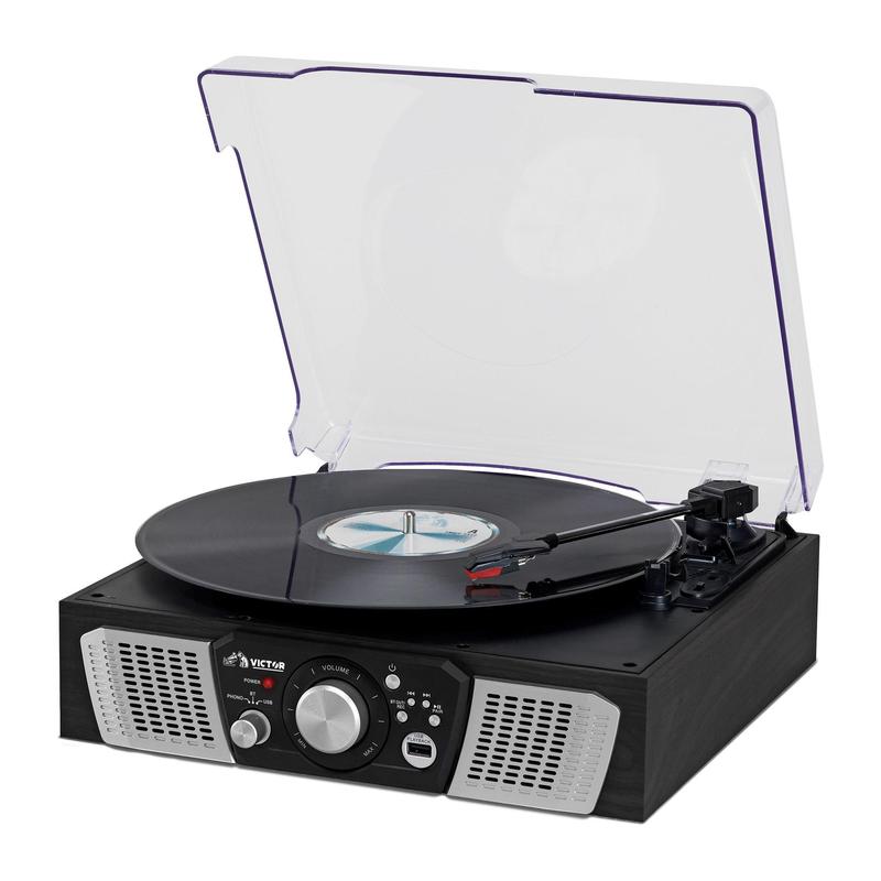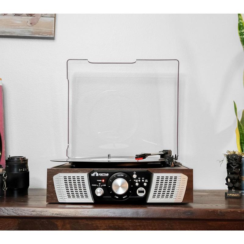 Remember the joy of spinning your favorite vinyl or cassette tapes? The Victor Lakeshore 5-in-1 Turntable System brings back those good vibes with modern convenience. Whether you're dusting off classic LPs or streaming today's hits via Bluetooth, this all-in-one music center has you covered. It plays vinyl records at three speeds—33-1/3, 45, and 78 RPM—plus CDs, cassette tapes, and FM radio with analog tuning. Built-in stereo speakers fill your room with rich sound, no extra equipment needed. Love digital? Use the USB port for easy one-touch recording and playback, so your favorite tunes are always at your fingertips. The compact design fits perfectly on your shelf or desk, weighing just under 5 pounds. Included are the turntable system, power cord, and manual to get you spinning right away. Ready to relive the classics or discover new favorites? Grab the Lakeshore and let the music play!