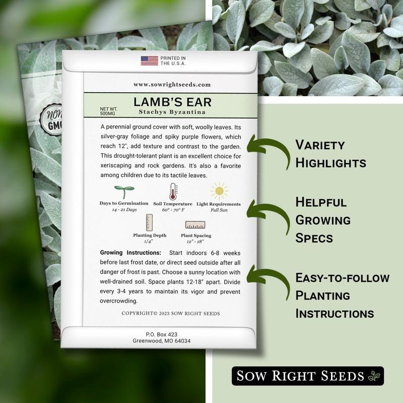 Seed packet contains 500mg (about 300 seeds). Start Lamb's Ear seeds indoors for early blooms - Large, premium seed packets give instructions on how to grow and when to plant outdoors.