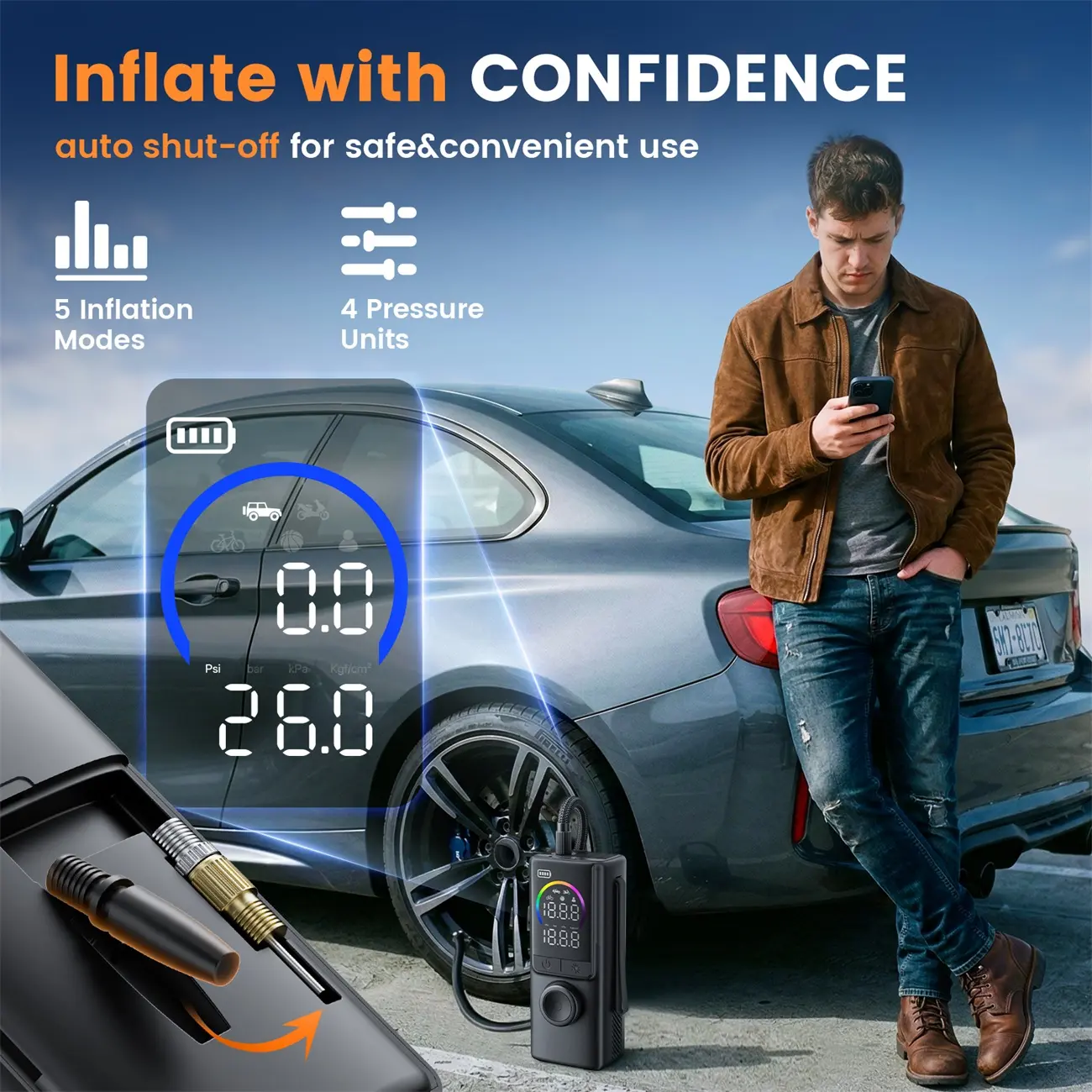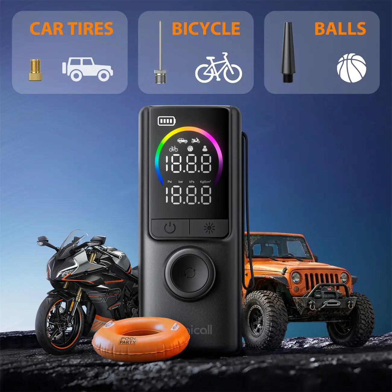 This Air Compressor has four pressure units: PSI, KPA, BAR, KG/CM², and five preset inflation modes for Car, motorcycle, bike, ball and customized pressure. As well as coming with 3 accessories: Brass Presta Valve Adapter, Ball Inflation Needle, Swimming Circle adapter.