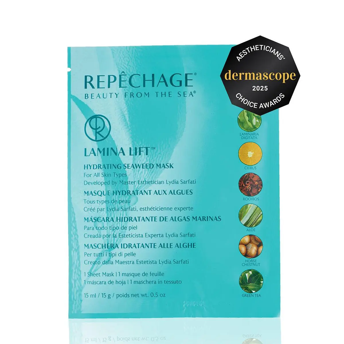 The Repêchage® Lamina Lift™ Mask is instantly refreshing and hydrating, leaving your skin dewy and glowing. Formulated with the exclusive Repêchage® Laminaria Digitata complex, combining seaweed, Orange Water, and Aloe, this convenient sheet mask also contains natural ingredients like Rooibos Tea, Licorice Root and Horse Chestnut extracts.