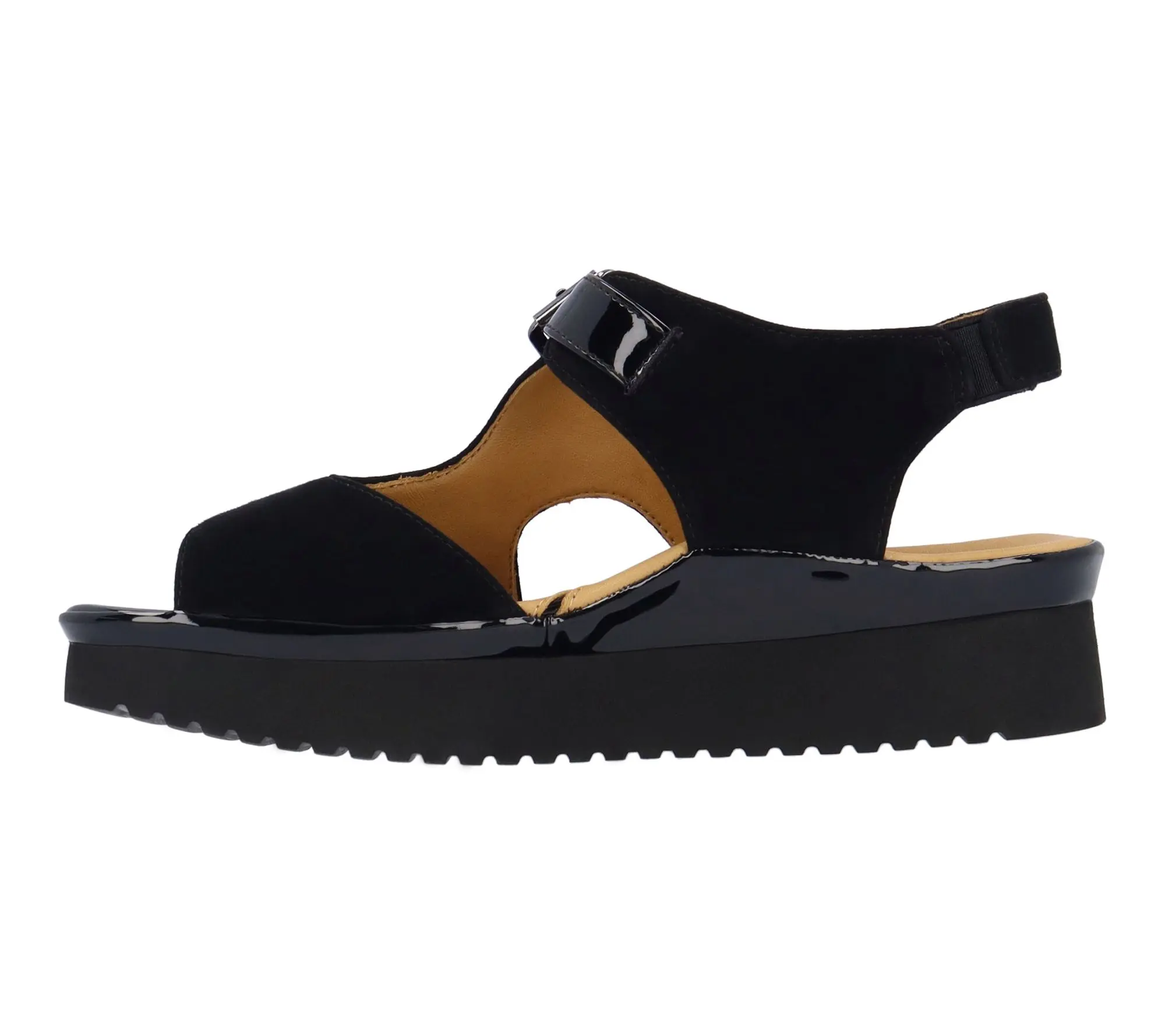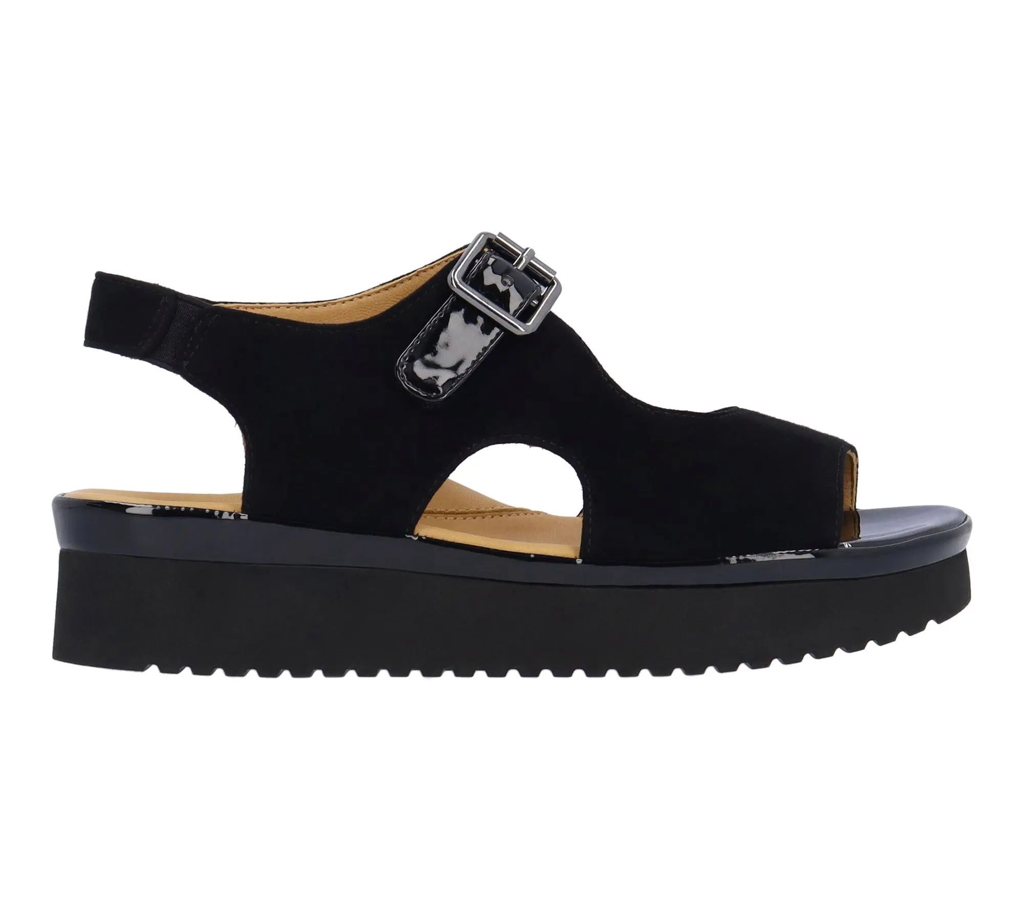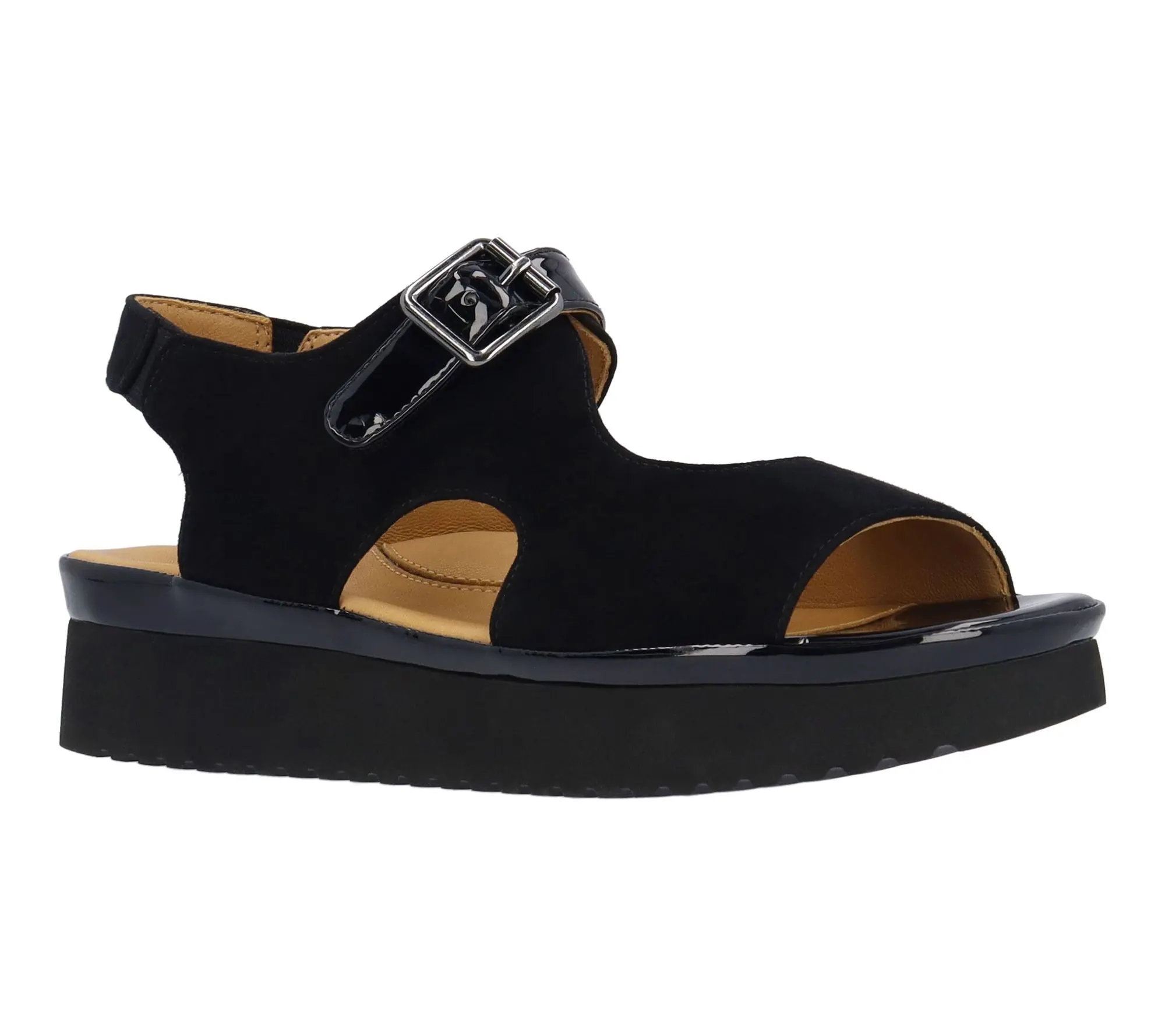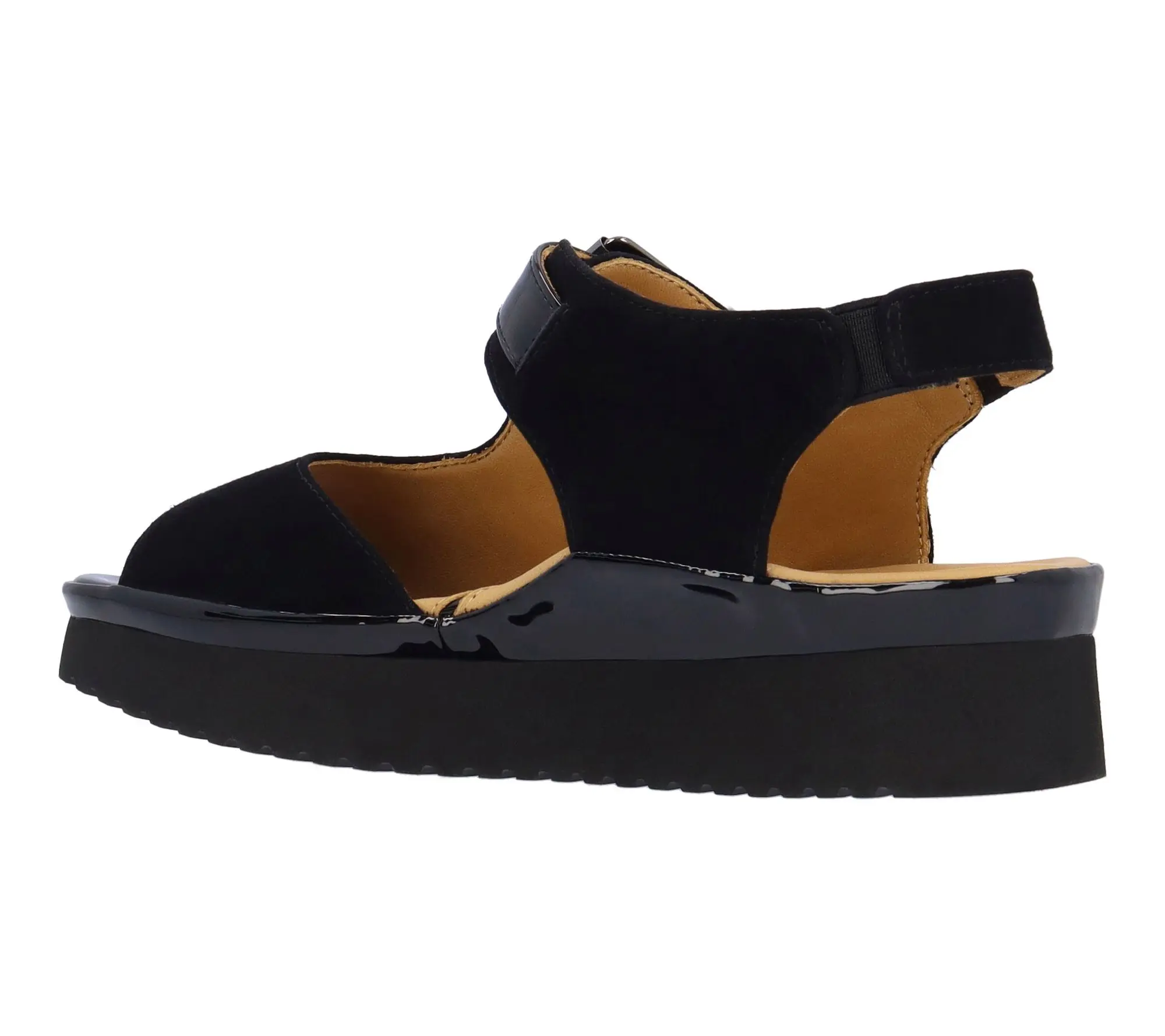 This sandal has a memory foam insole, leather lining and synthetic outsole. This shoe has a hook and loop closure on a 1.75 inch heel. This style comes in black suede goat leather.;Shoes
