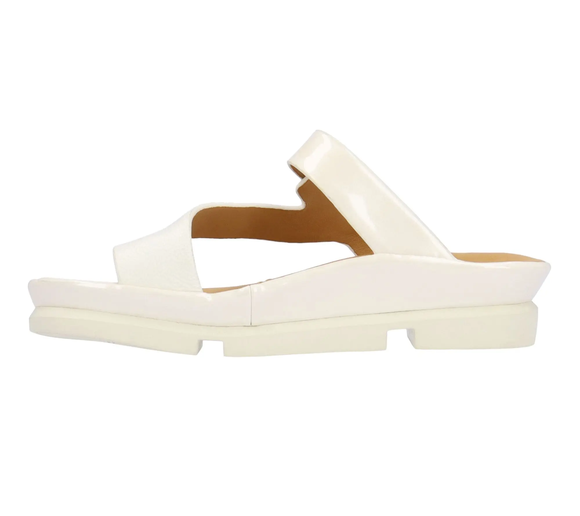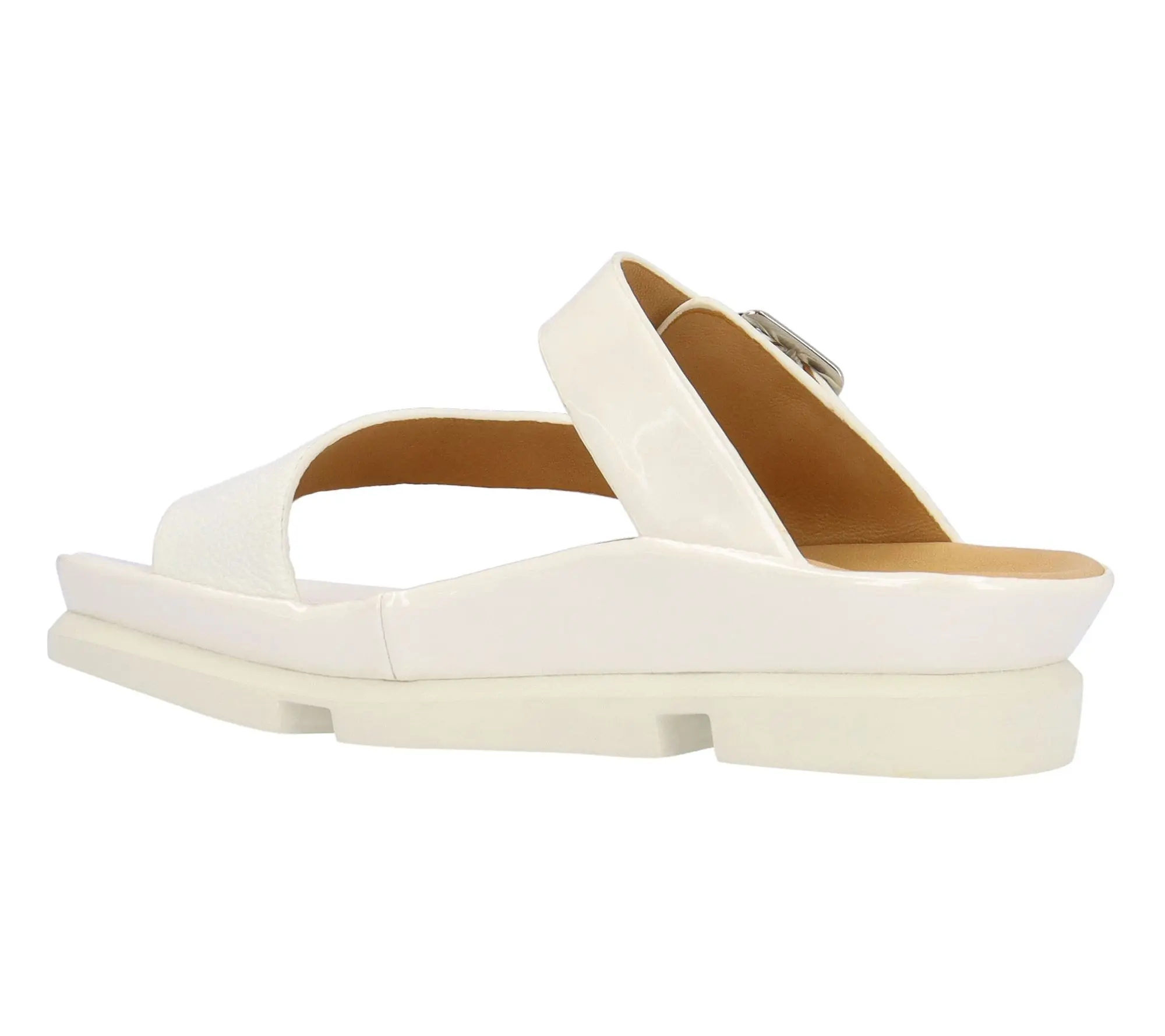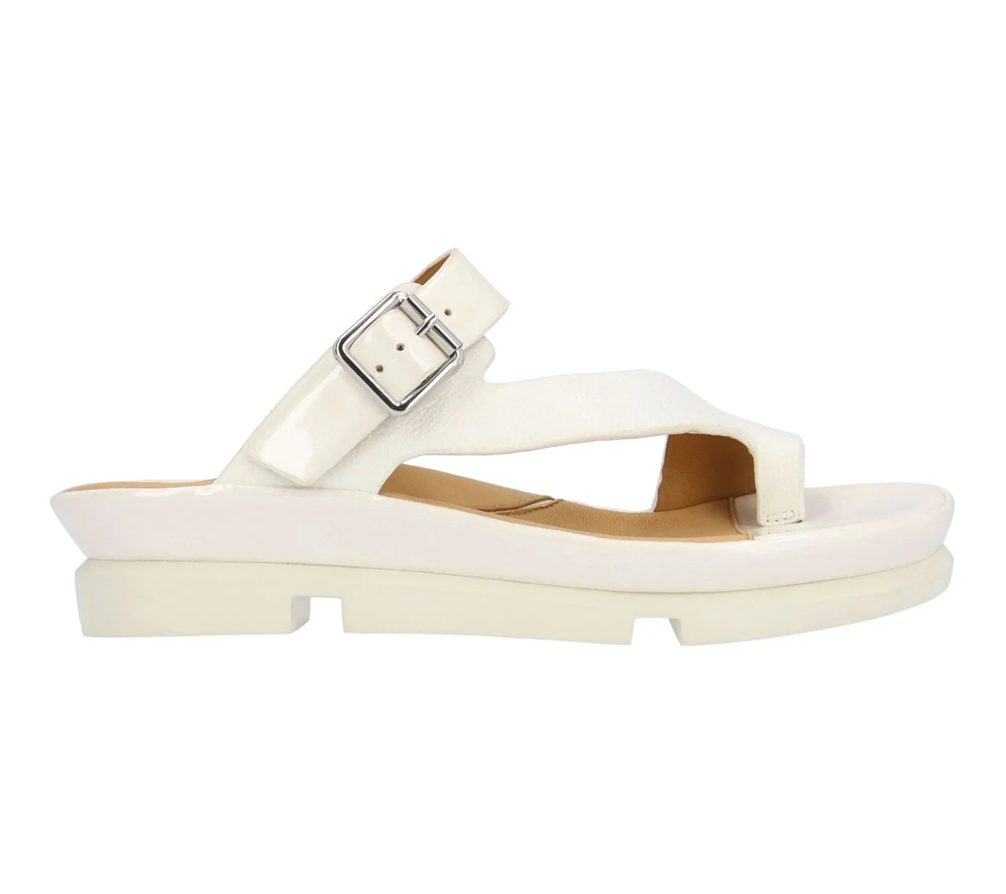 This sandal has a memory foam insole, leather lining and synthetic outsole. This shoe has a buckle closure on a 1.75 inch heel. This style comes in nude goat leather, white cow leather.;Shoes
