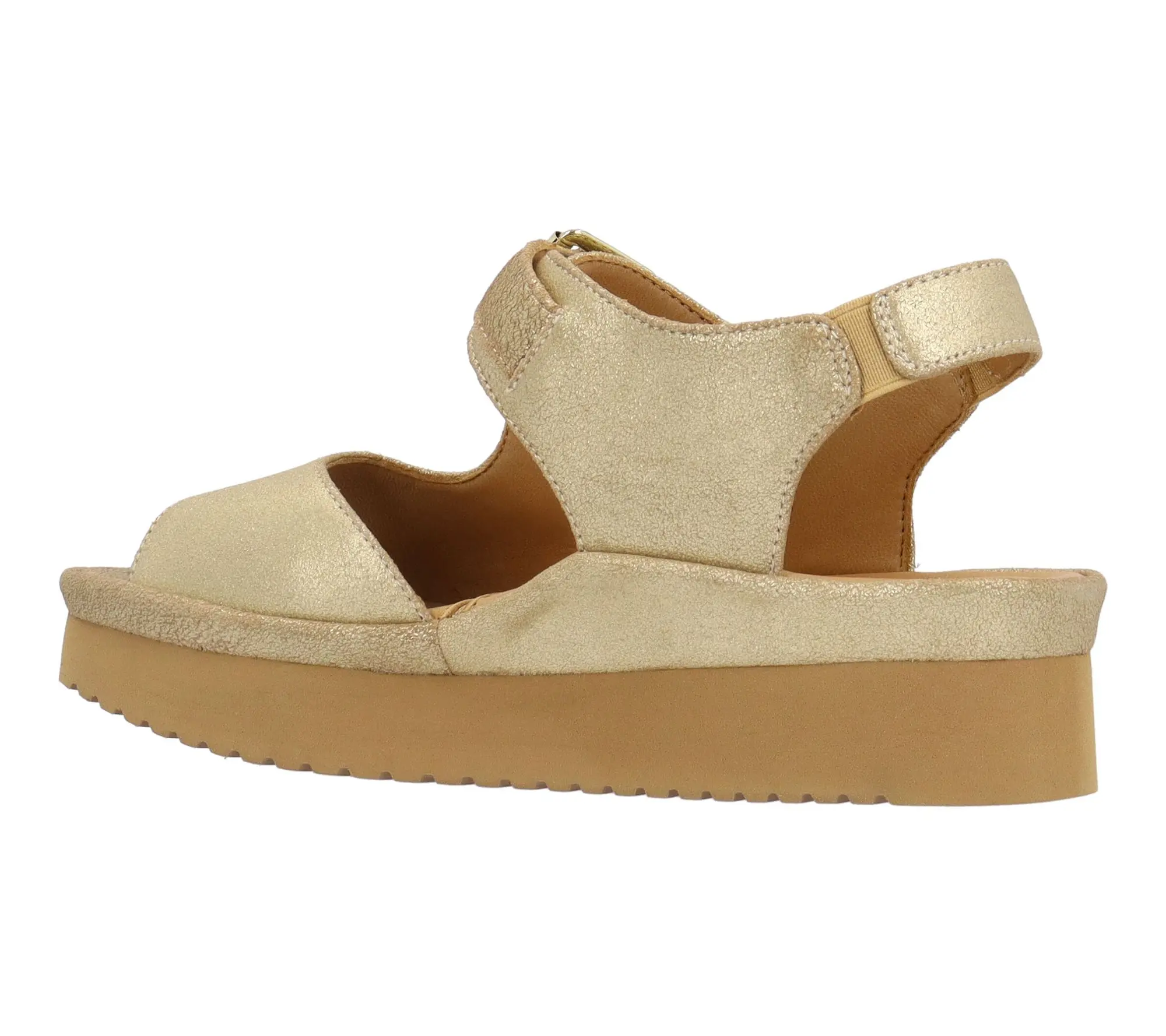 This sandal has a memory foam insole, leather lining and synthetic outsole. This shoe has a hook and loop closure on a 1.75 inch heel. This style comes in gold suede cow leather.;Shoes