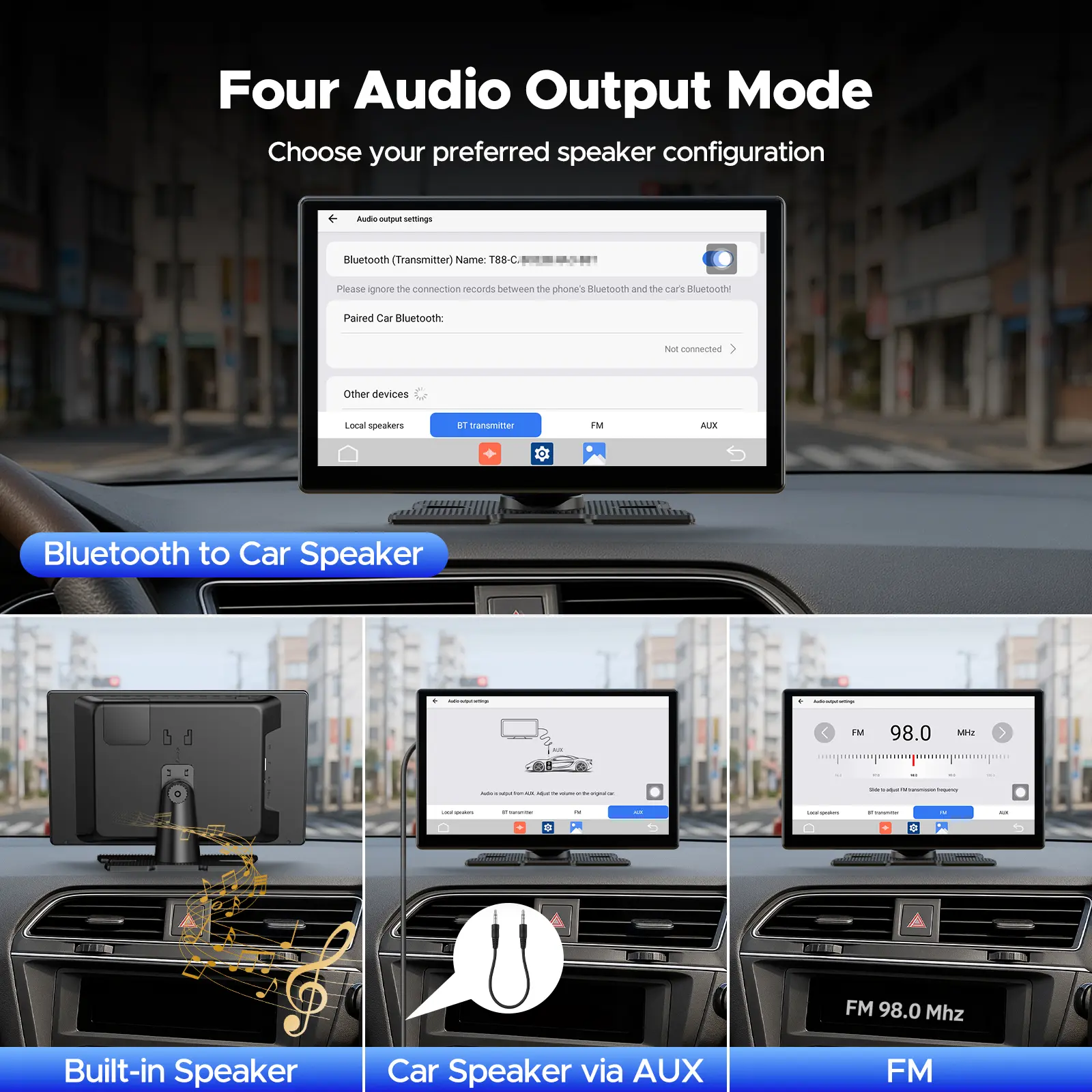 【Works in Any Car】:Four audio output options: Bluetooth, FM Transmitter, AUX cable, or the built-in speaker. Easily adapts to new and old cars with guaranteed sound quality.