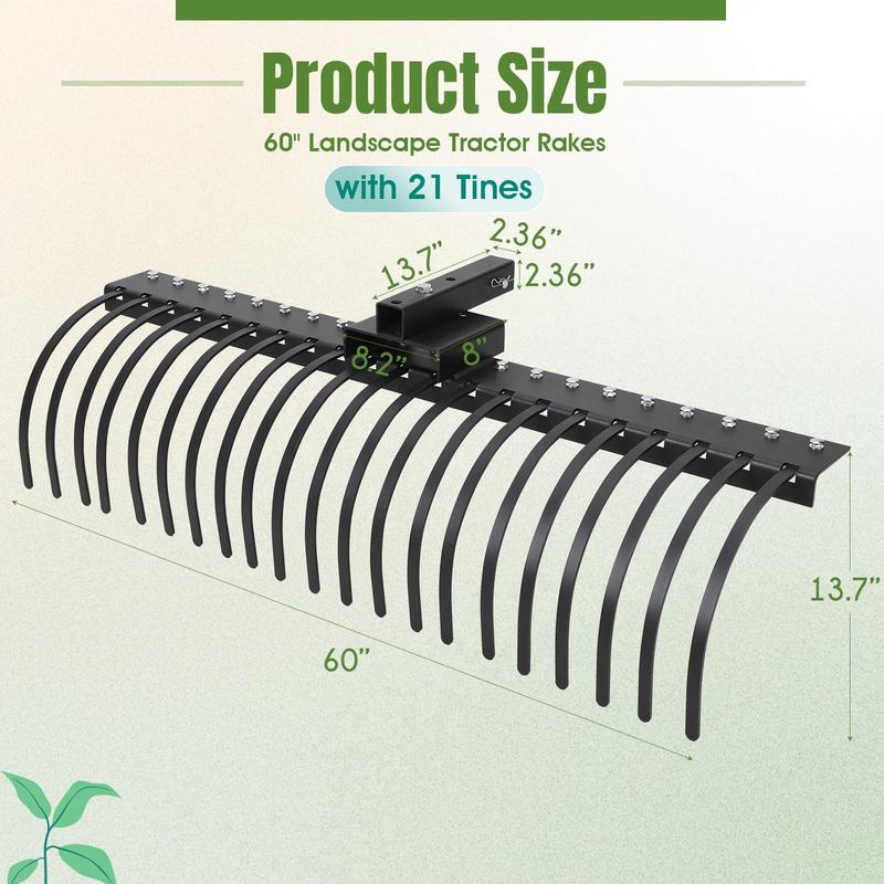 This 3 point rock rake is compatible with Category 1 tractors. It fits a 2-inch receiver ATV UTV 60" accessory toolbar & 3 point hitch system.