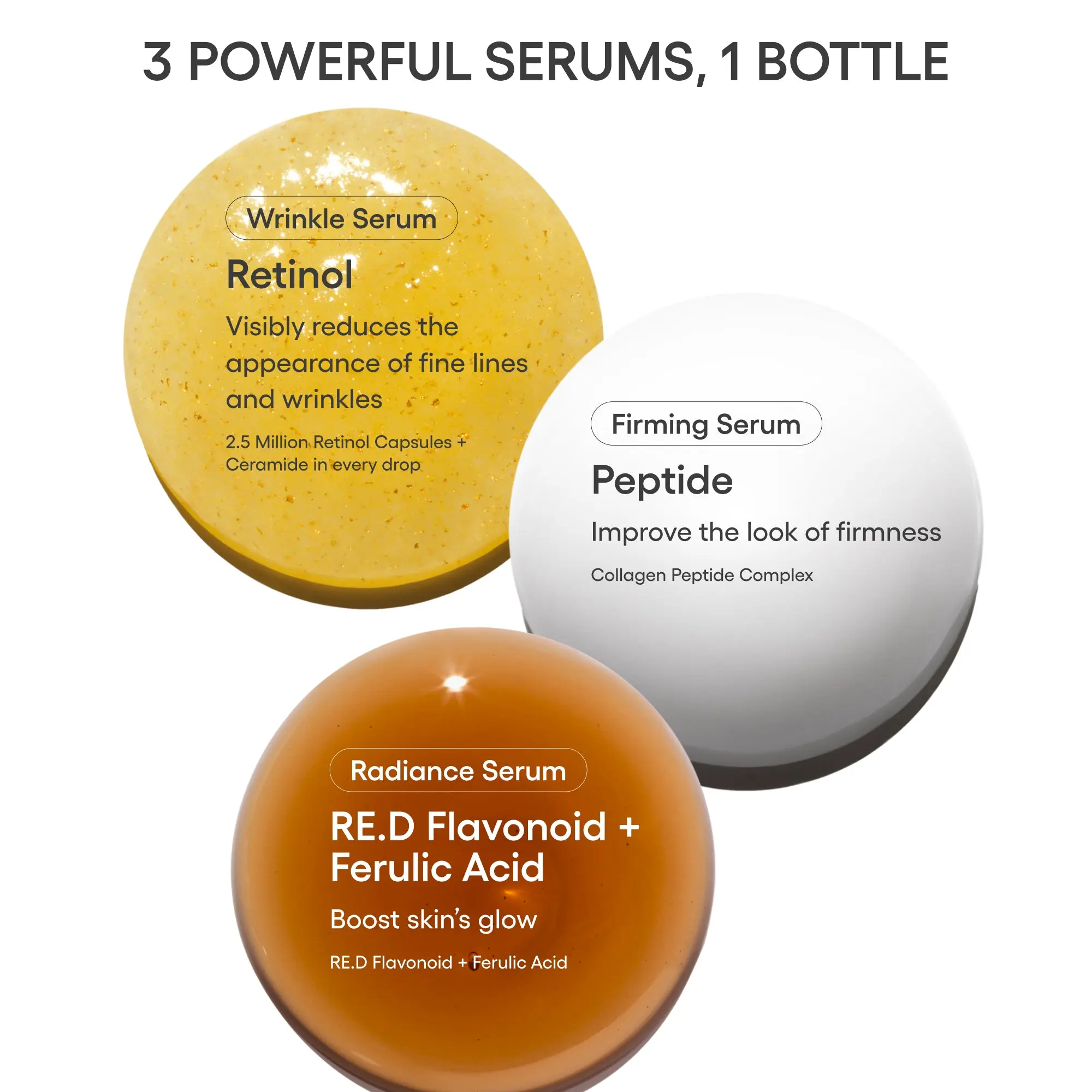 | Ingredients | #1. Radiance Serum (Brown) WATER / AQUA / EAU, glycerin, butylene glycol, glyceryl polymethacrylate, dipropylene glycol, 1,2-hexanediol, xylitol, polyacrylate crosspolymer-6, lactobacillus ferment, ammonium acryloyldimethyl taurate/VP copolymer, sodium polyacryloyldimethyl taurate, Habelaria rhodopensis leaf extract, propanediol, tranexamic acid, dextrin, cocoa bean extract, disodium EDTA, ethylhexylglycerin, adenosine, dipotassium glycyrrhizate, bioflavonoids, t-butyl alcohol, ferulic acid, chaga mushroom extract, tocopherol #2. Elasticity Serum (White) WATER / AQUA / EAU, dimethicone, butylene glycol, glycerin, 1,2-hexanediol, polysilicone-11, PEG-10 dimethicone, pentaerythrityl tetraethylhexanoate, dimethicone/vinyl dimethicone crosspolymer, vinyl dimethicone/methicone silsesquioxane crosspolymer, dimethiconol, polysorbate 20, boron nitride, sclerotium gum, ammonium acryloyldimethyl taurate/beheneth-25 methacrylate crosspolymer, ammonium acryloyldimethyl taurate/VP copolymer, sodium polyacryloyldimethyl taurate, glyceryl caprylate, caprylyl glycol, ethylhexylglycerin, disodium EDTA, adenosine, Hydrolyzed collagen, acetyl tetrapeptide-2, tocopherol #3. Wrinkle Serum (Yellow) WATER / AQUA / EAU, butylene glycol, glycerin, diphenyl dimethicone, 1,2-hexanediol, diphenyl siloxy phenyl trimethicone, soybean oil, gellan gum, sunflower seed oil, xanthan gum, fragrance, sodium chloride, carrot extract, silica dimethyl silylate, dipotassium glycyrrhizate, magnesium sulfate, ethylhexylglycerin, retinol, adenosine, disodium EDTA, gold, tocopherol, ascorbyl tetraisopalmitate, BHT, beta-carotene, ceramide NP |