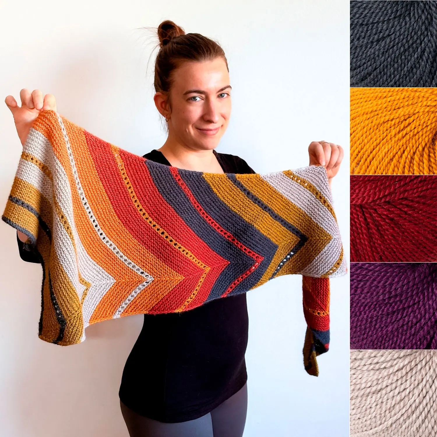 Elevate your knitting with the Laneway Shawl Project Bundle, a versatile and stylish DIY kit. This asymmetrical triangular shawl is a journey in color and texture, featuring bold garter stitch sections paired with delicate eyelet bands. Play with shades and yarn combinations to create a shawl uniquely yours. I-cord edges give a polished finish, and the flowing structure results in a cozy yet elegant accessory suitable for any season.