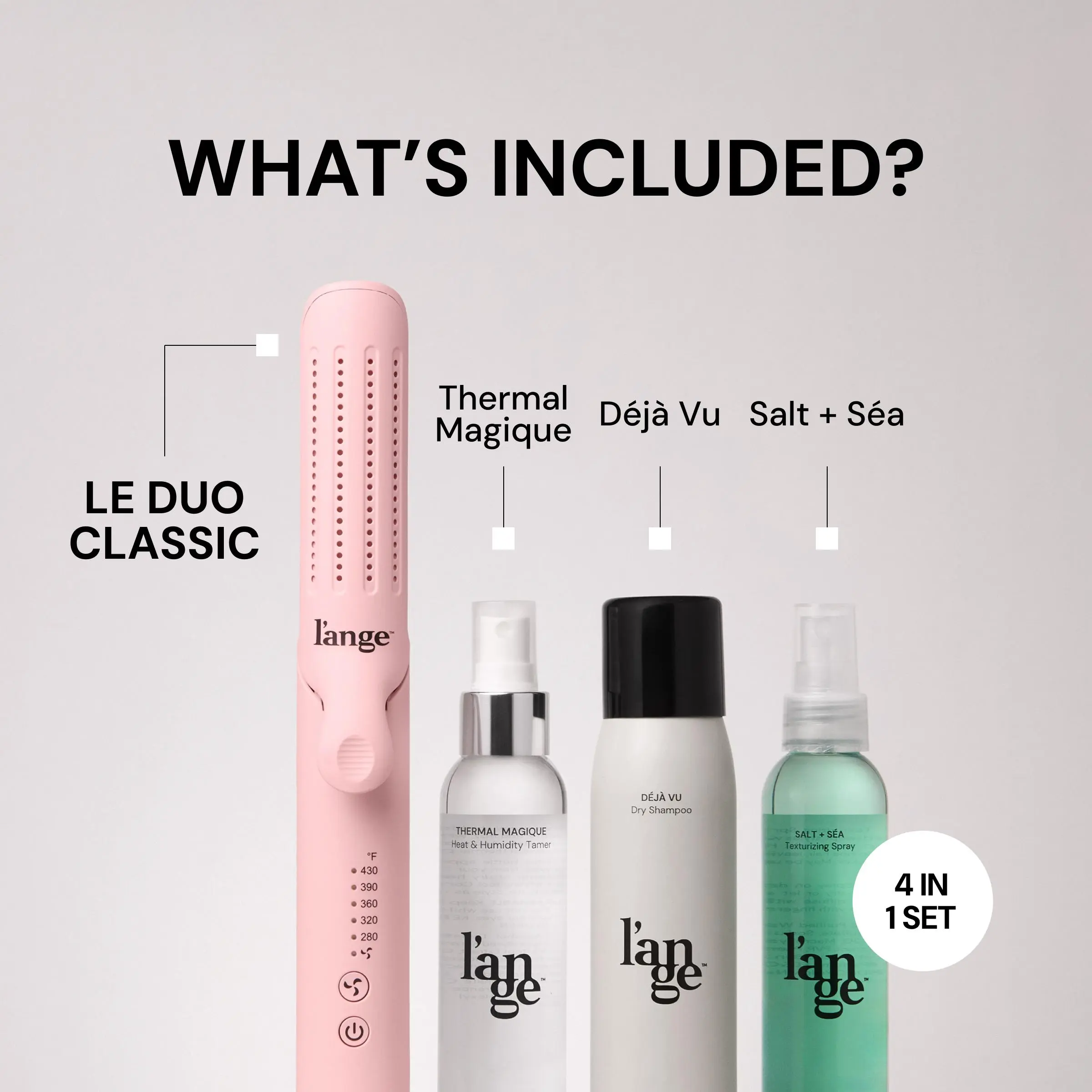 With 2.5 million+ sold, Le Duo is a best seller for a reason. The rounded design and innovative cooling vents of this unique curling iron helps you create curls, waves or straight styles and our unique air vents instantly lock-in your look for days. Start by spraying Salt + Séa on your damp hair for extra texture, followed by Thermal Magique for protection against heat and humidity. Then, begin styling your dry hair with Le Duo Classic to create bouncy curls or beachy waves. Finally, add more volume or refresh your look with Déjà Vu and rock your curls for days!