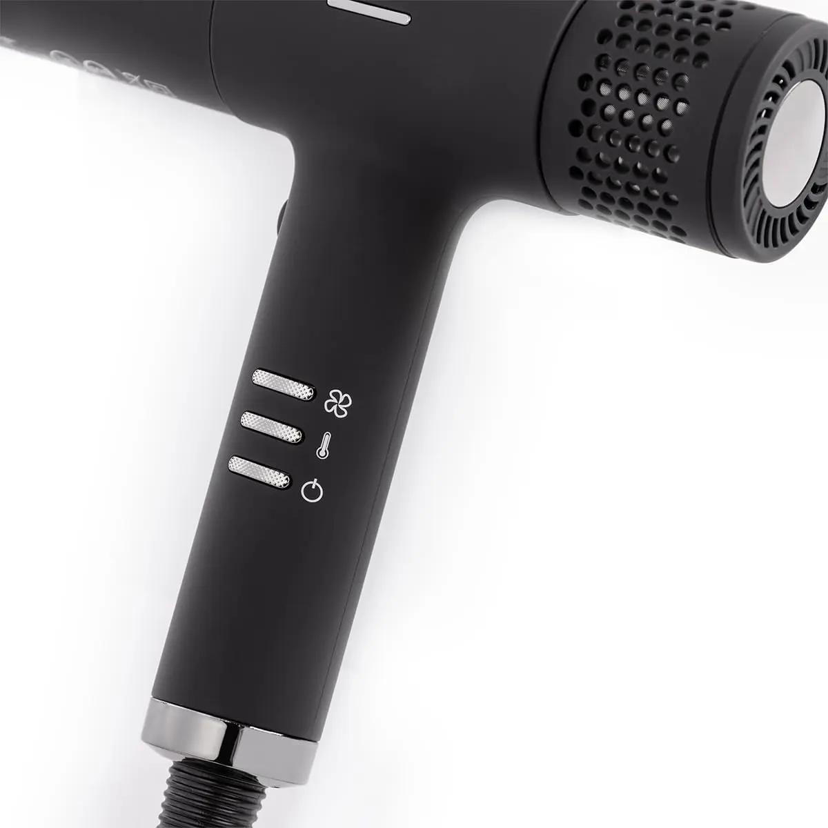 It is very quiet and leaves my hair like in the salon. I highly recommend it. The digital screen is perfect for controlling the temperature. It is light and allows you to use both hands, which is an issue with larger hair dryers.