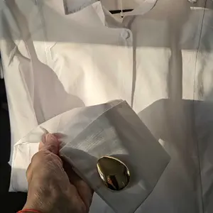 This blouse is exquisite and elegant for a night on the town.It has gold buttons cuffs and wide sleeves. A fashion statement You can style at your own liking. So glad I purchased this blouse. Make sure you size up it’s cut small. I wear a L but got a 2X. I recommend.